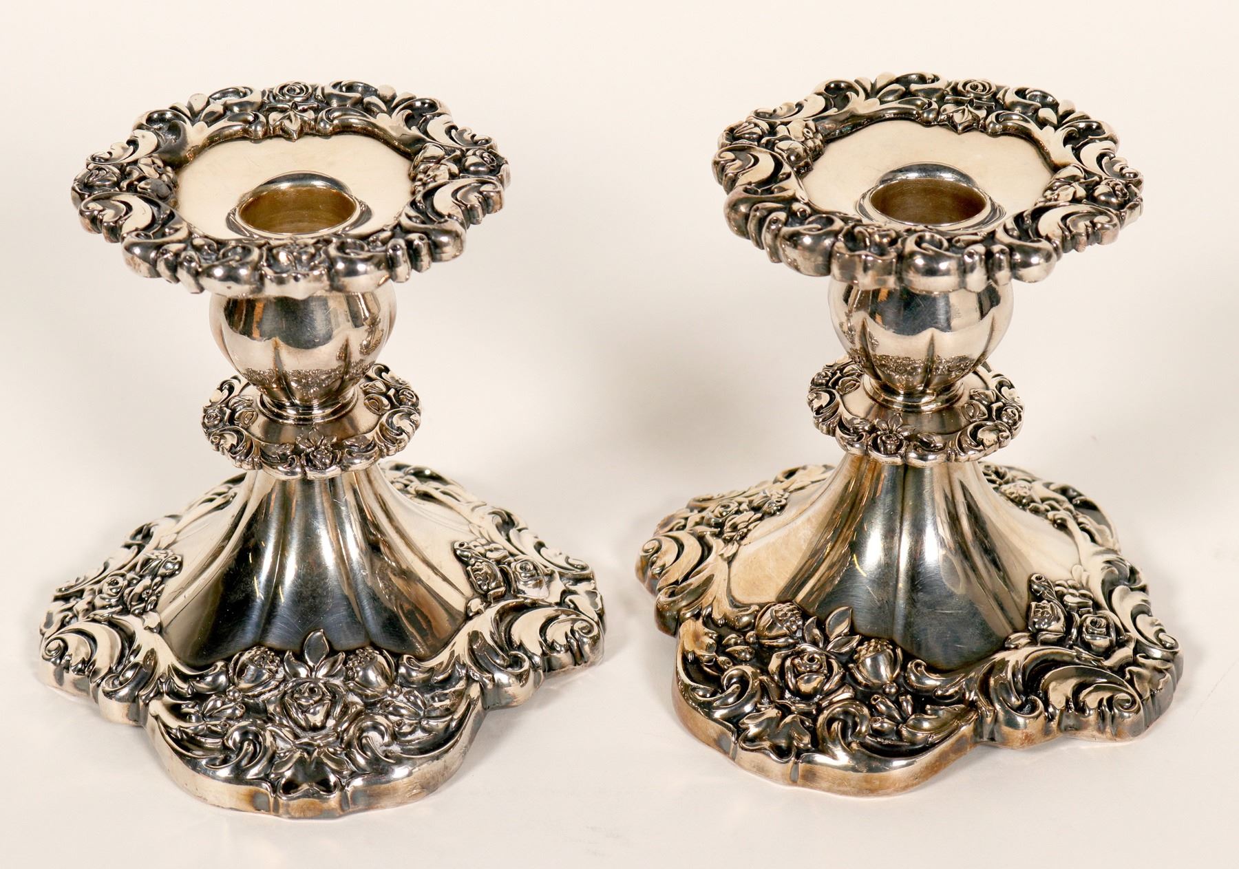 This pair of vintage Lunt silverplate candlesticks have a gorgeous, ornate pattern with heavy embossing. Marked on the bottom "Lunt E-61, they are significant pieces double dipped sterling plated and heavy (2.6 lb each). 4.75" high x 5.5" base diameter x 3.5" top diameter. In 1902, George C. Lunt, an engraver in the A .F. Towle & Son company, bought the business and renamed it Rogers, Lunt and Bowlen Co. The company has remained in the Lunt family hands since the founding. In 1935, the name was changed to Lunt Silversmiths. In late 2009, the company sold its name and inventory to competitor Reed & Barton. In early 2010, the company filed for bankruptcy protection and all remaining manufacturing & inventory assets at the Greenfield, Massachusetts factory were sold at auction.
