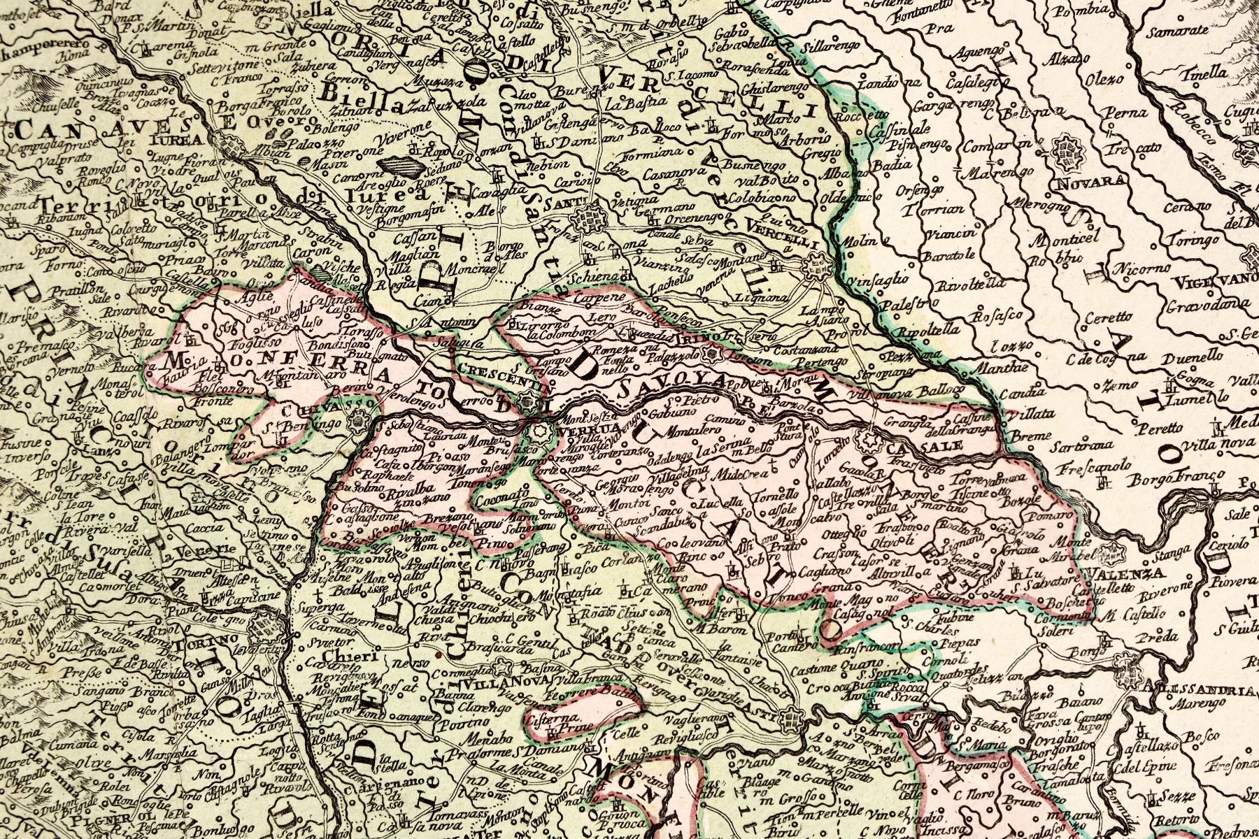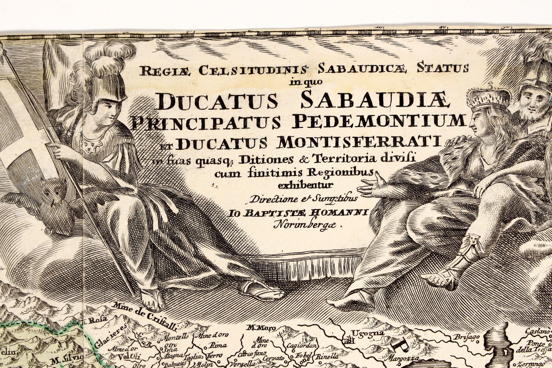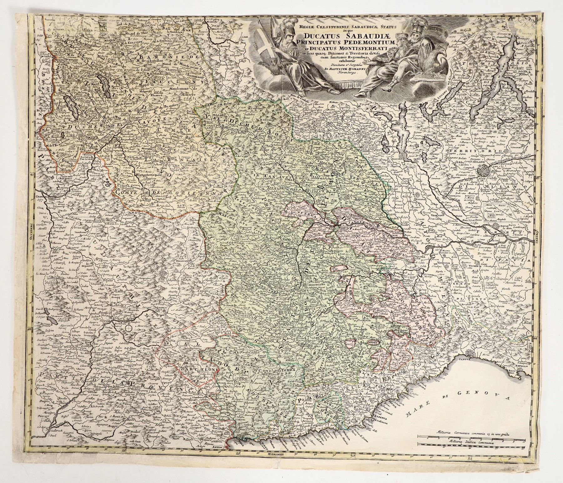 Map of Principality of Piedmont, showing the Alps, France on the left, 1724-80. 20 x 23 ". Copper engraved, hand colored. Under the soldier vignette left foot are Mine de Cuivre -copper mine, mine de cristalli=crystal mine and mine d'ore-ore mine. In good cond.