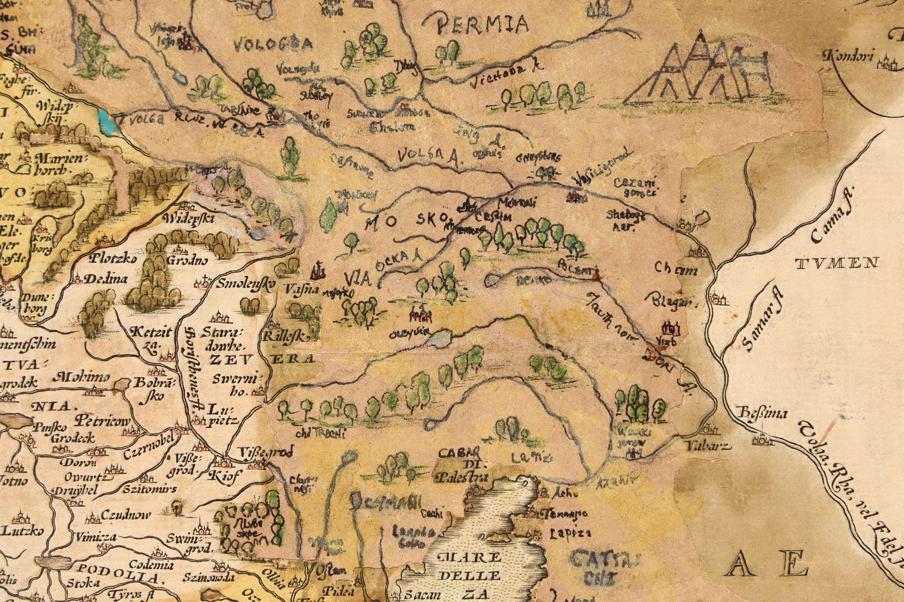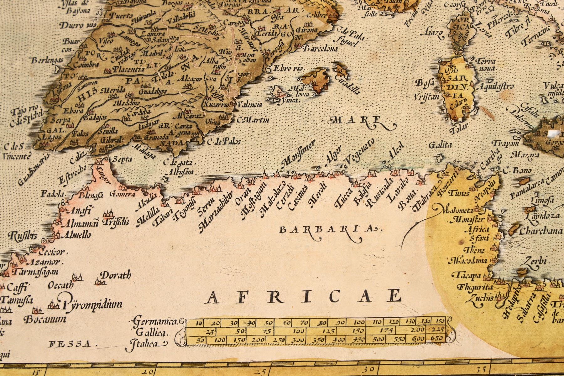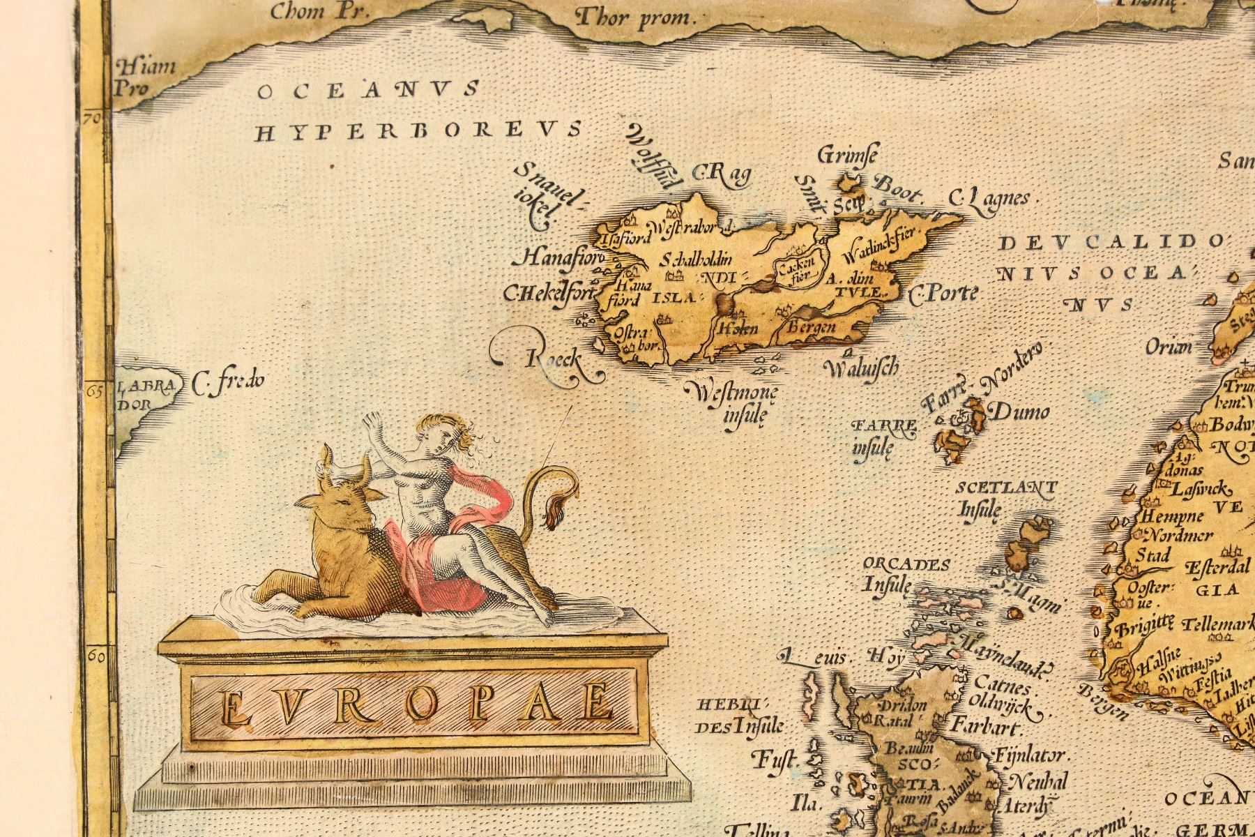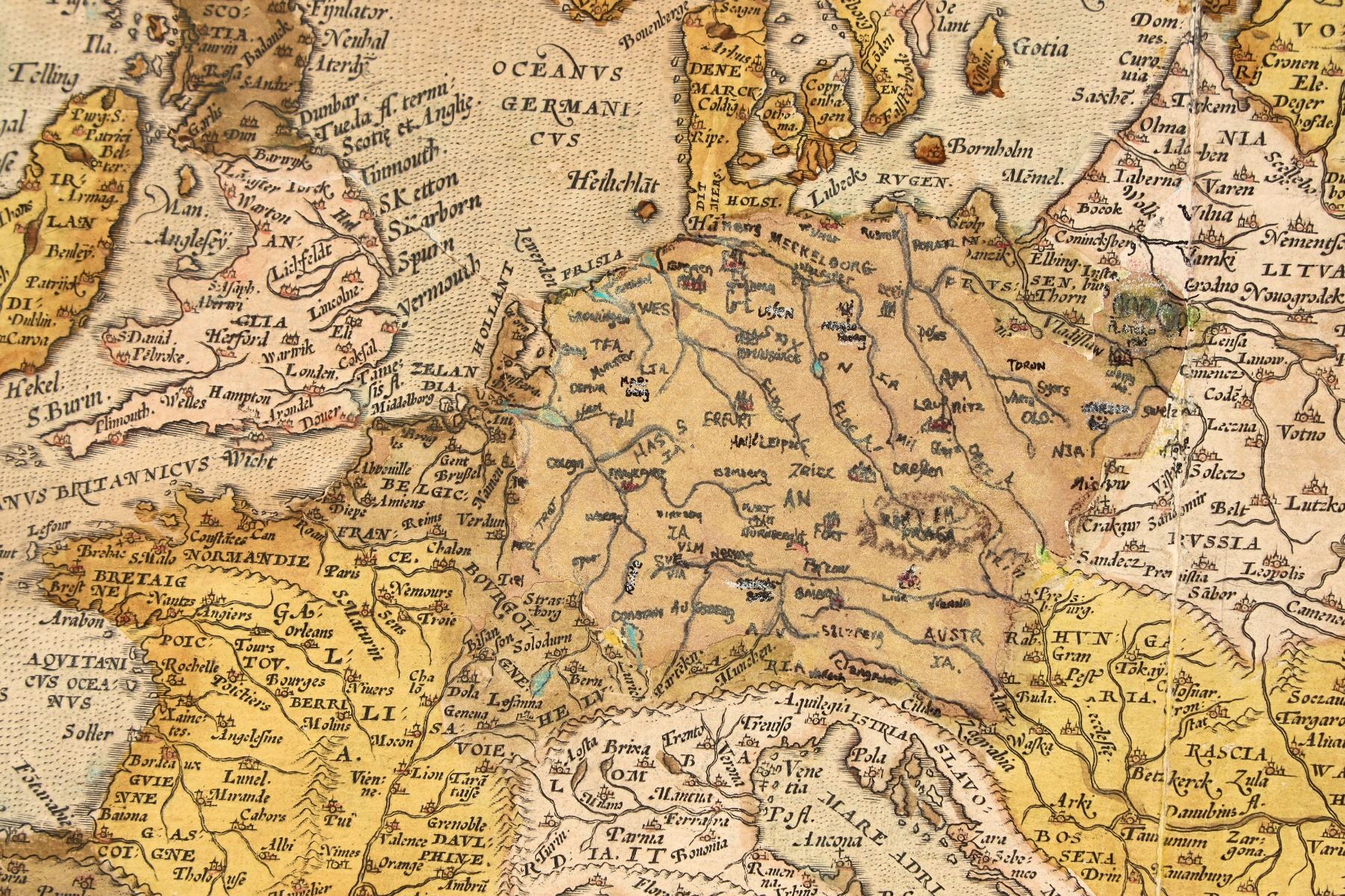 Map of Europe 1584, copper engraved and hand colored. 14 x 18 ". Story on back "Europe". Major repair on back. The acid in the brown ate the paper away, restored pieces in place.