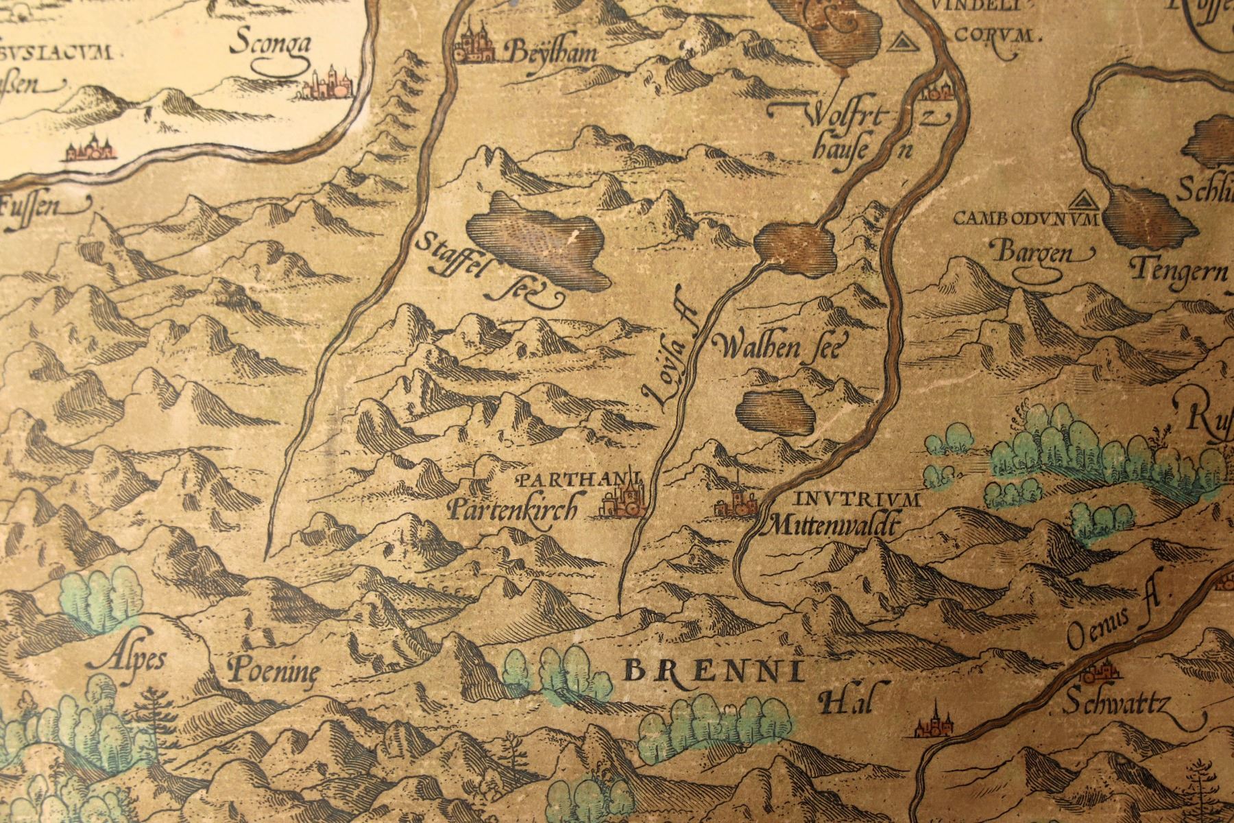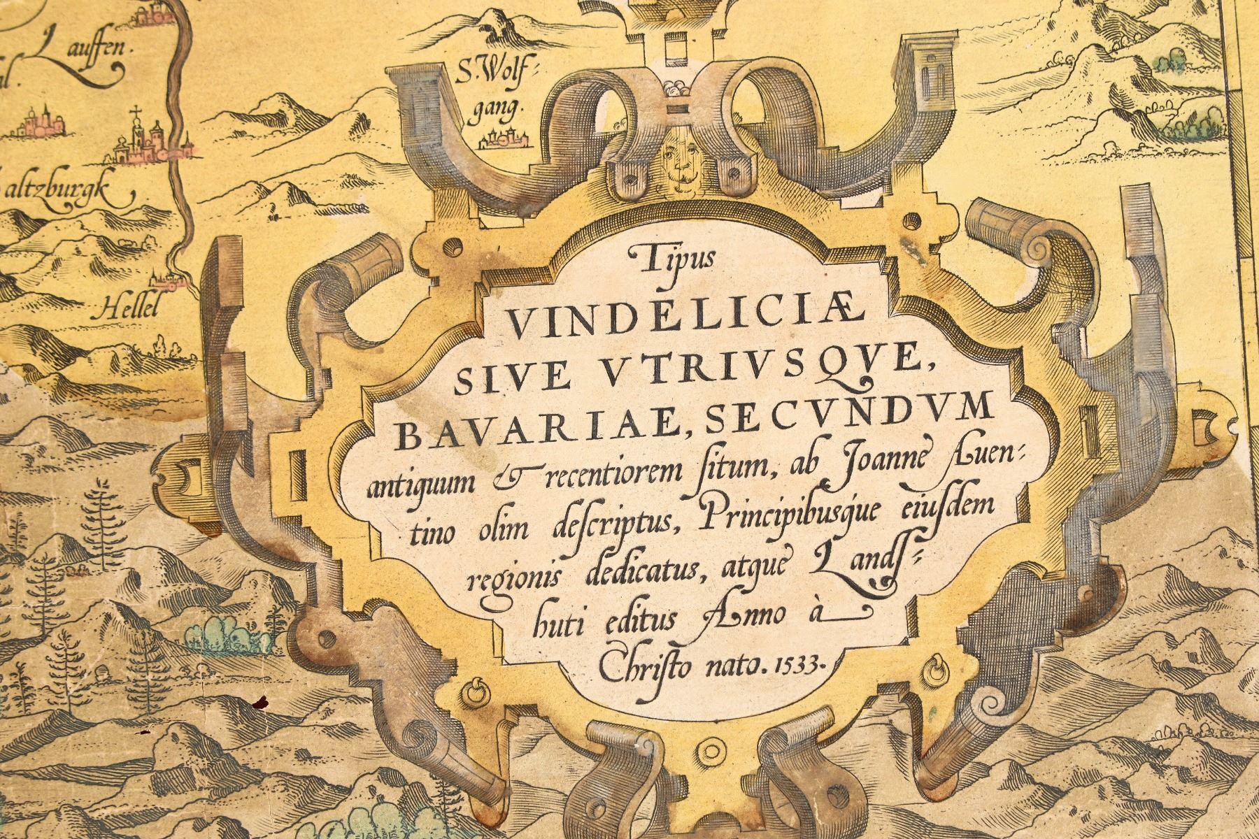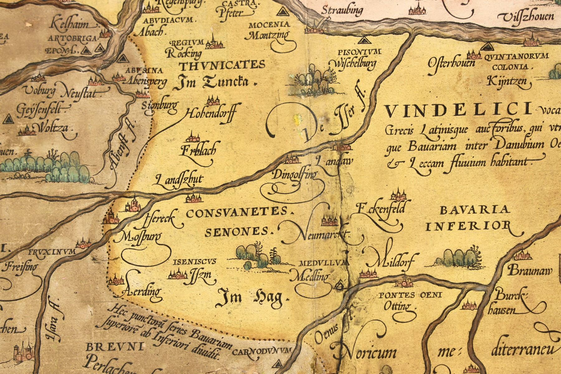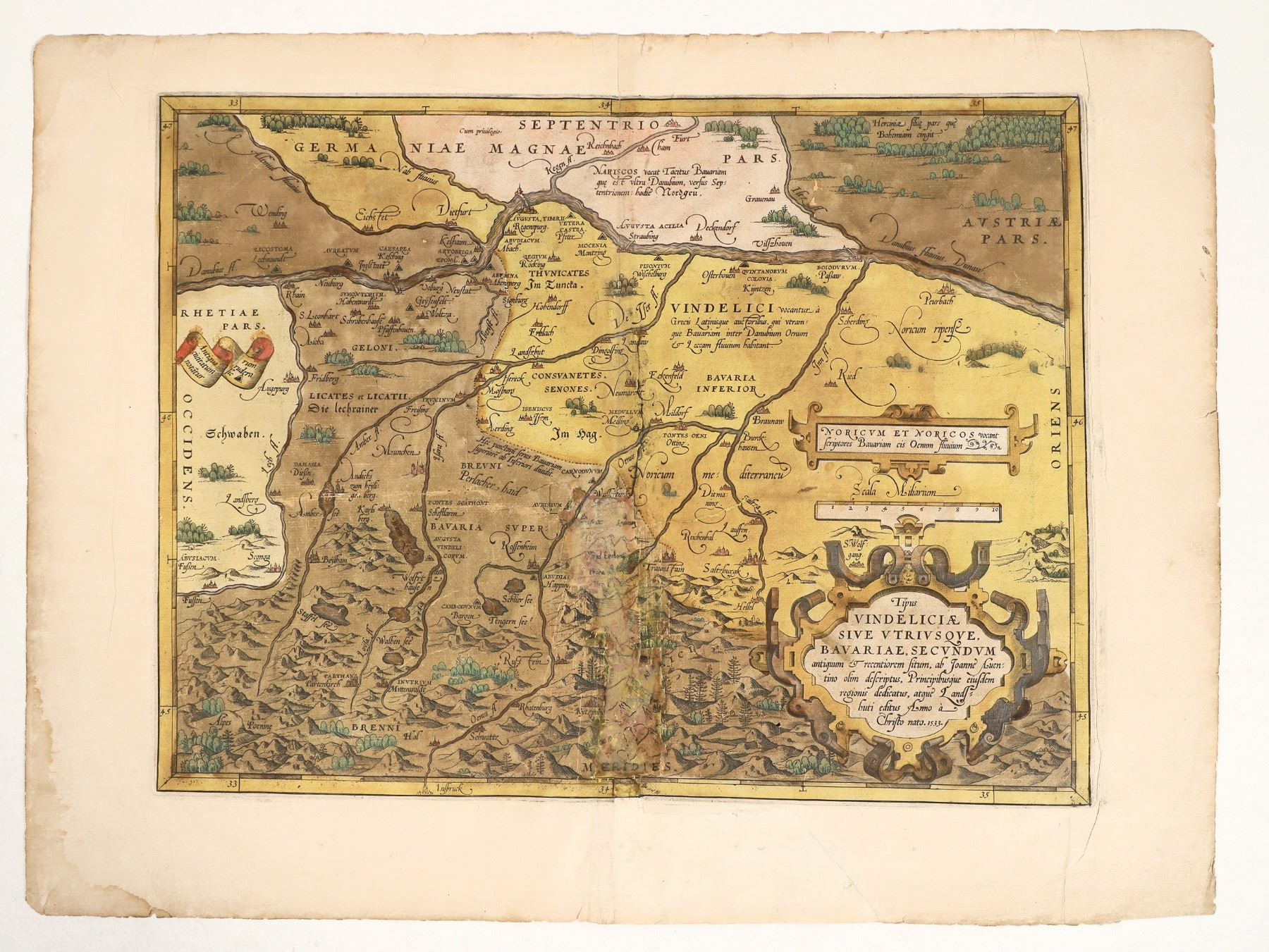 Map of upper and lower Bavaria , 1533. Story on back "The Country of Bavaria". Copper plate engraving, hand coloring. 16 x 21.5". Map has had major tape repairs . Today Bavaria is known as "The Free State of Bavaria" in Germany.