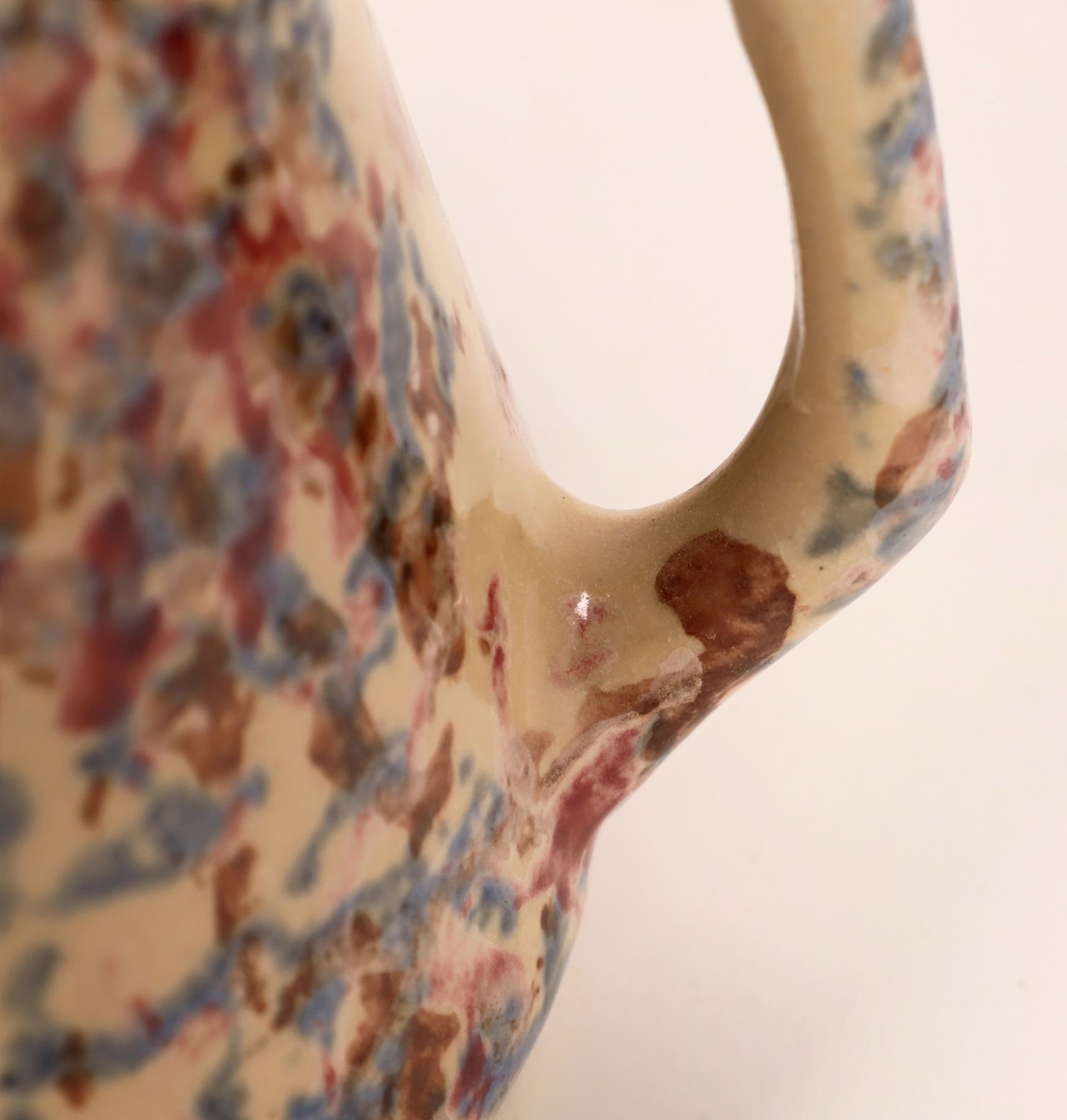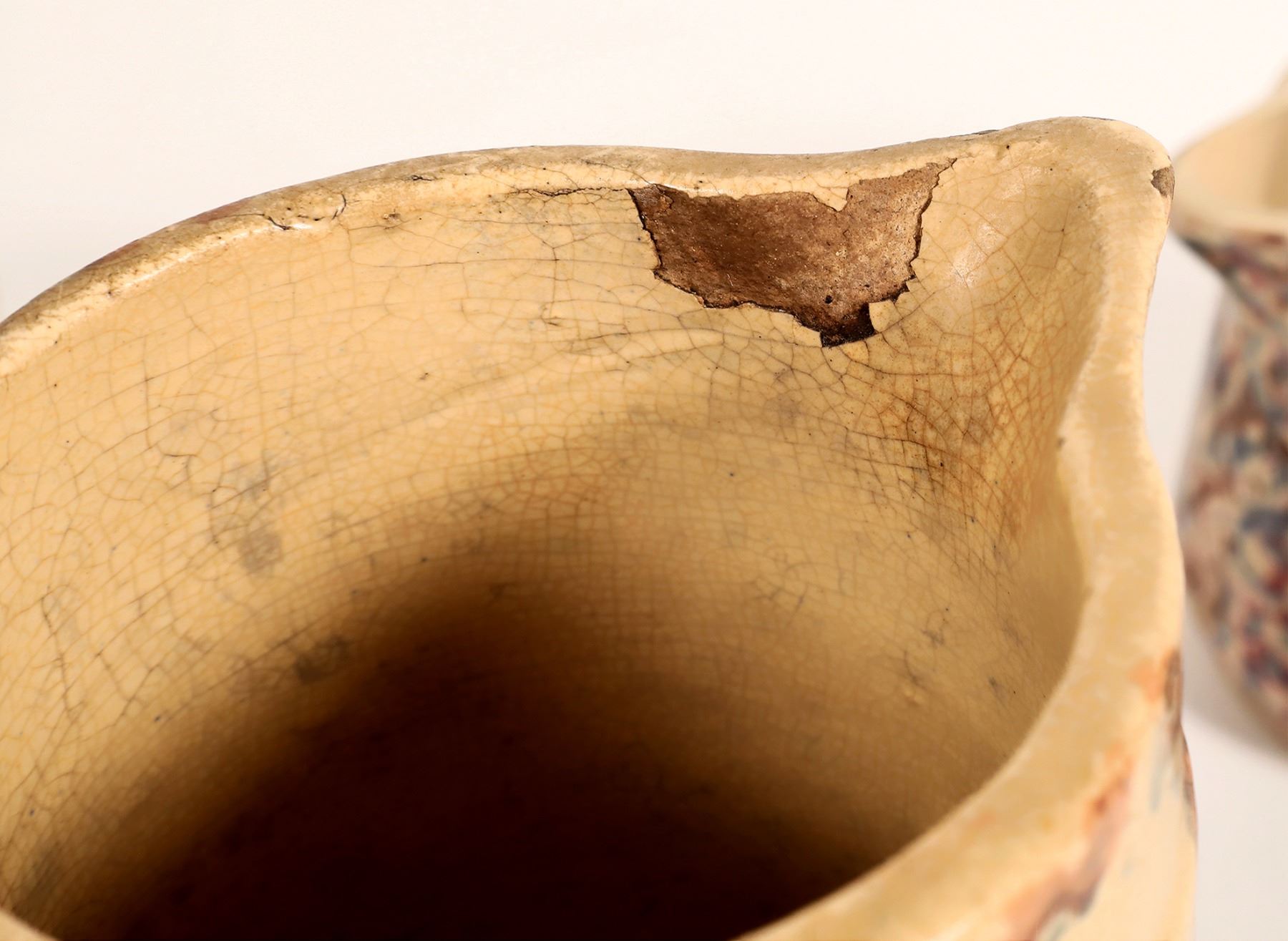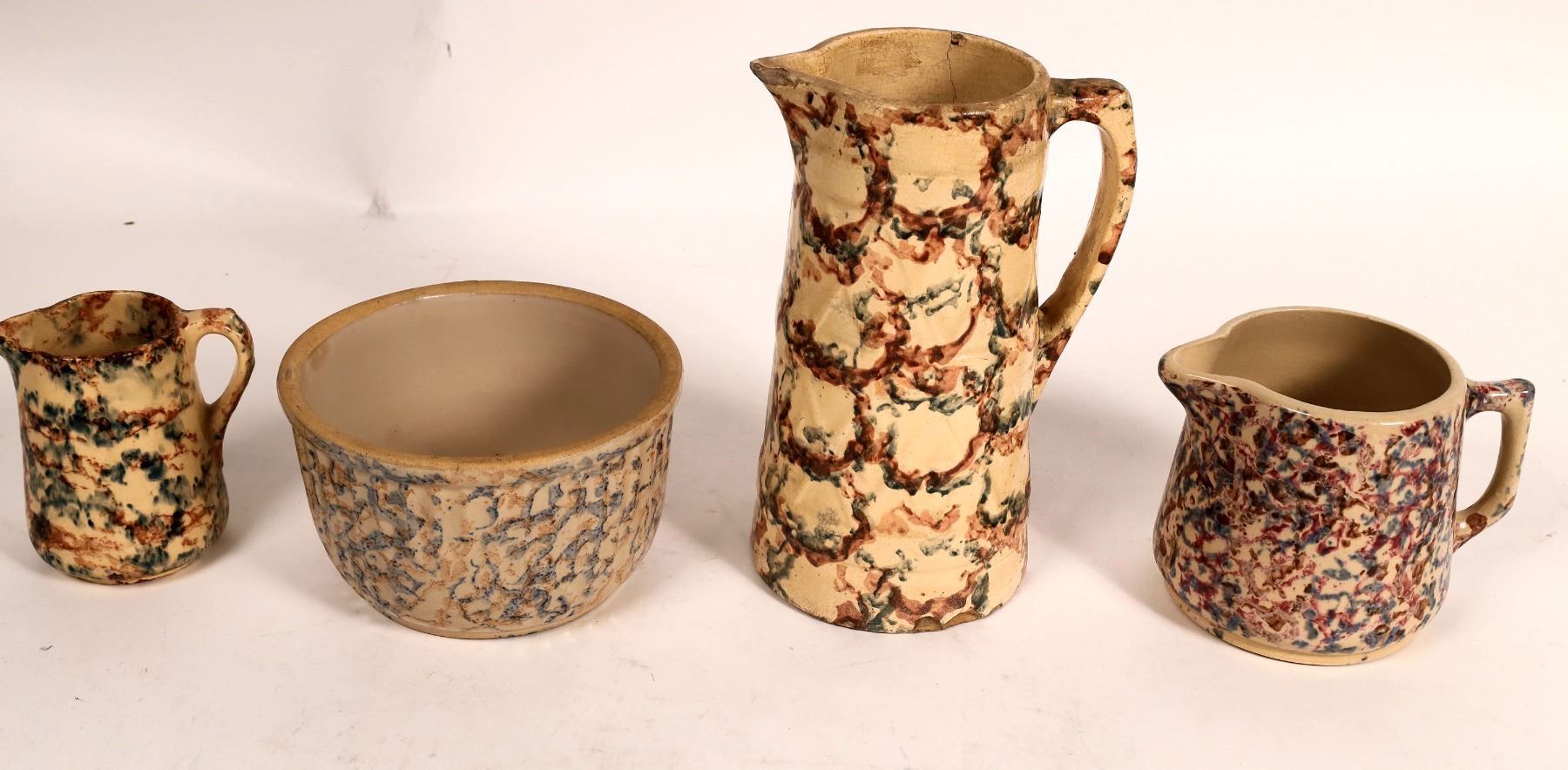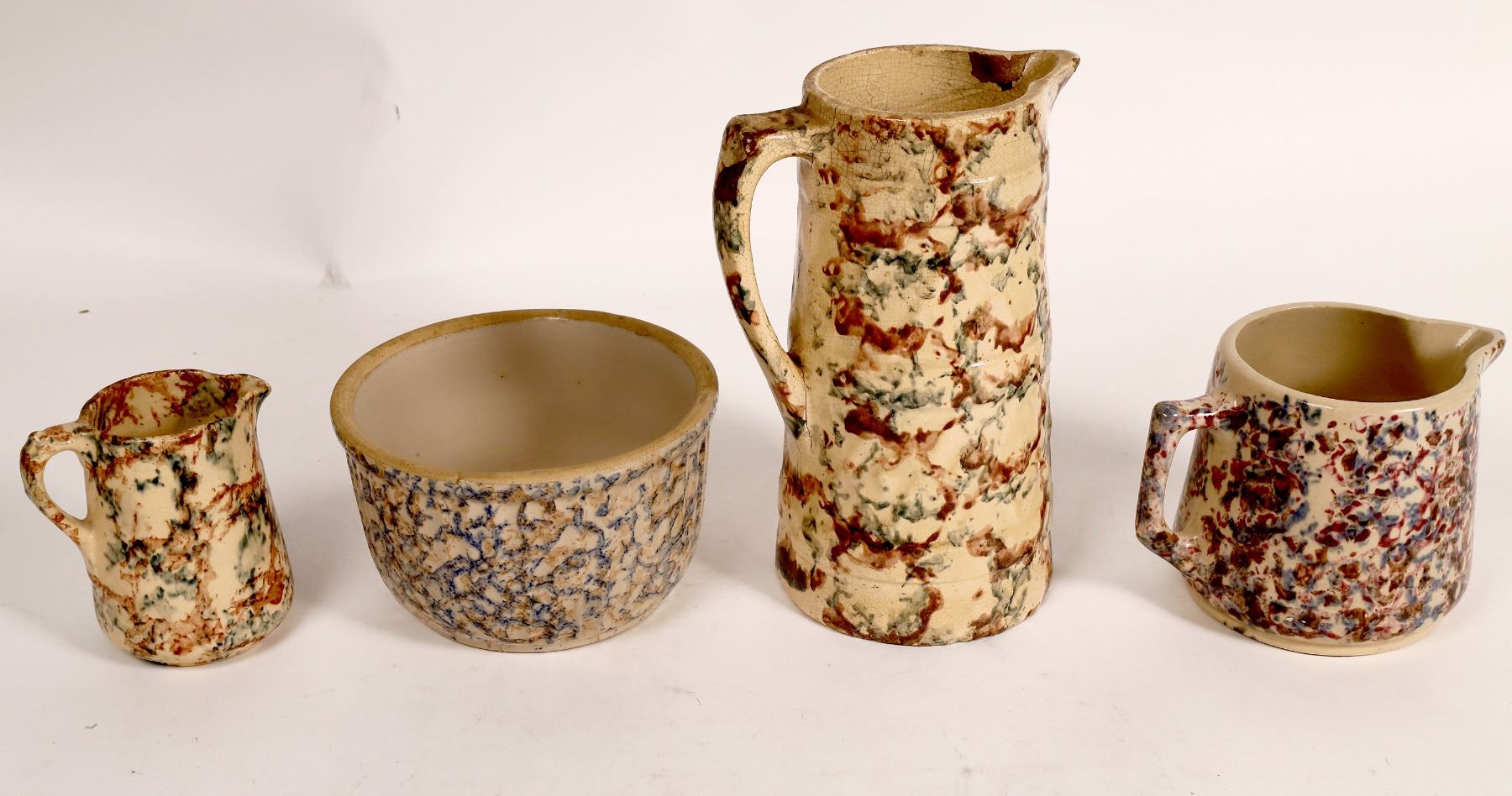 3 unmarked vintage marbled pitchers and a marbled bowl. Bowl marked Red Wing 4.25x6.5". Pitchers-5x4.75", 5x6", 9.5x6"-glazing has spiderweb cracking, inside lip chip. Other items, no apparent chips or cracks.