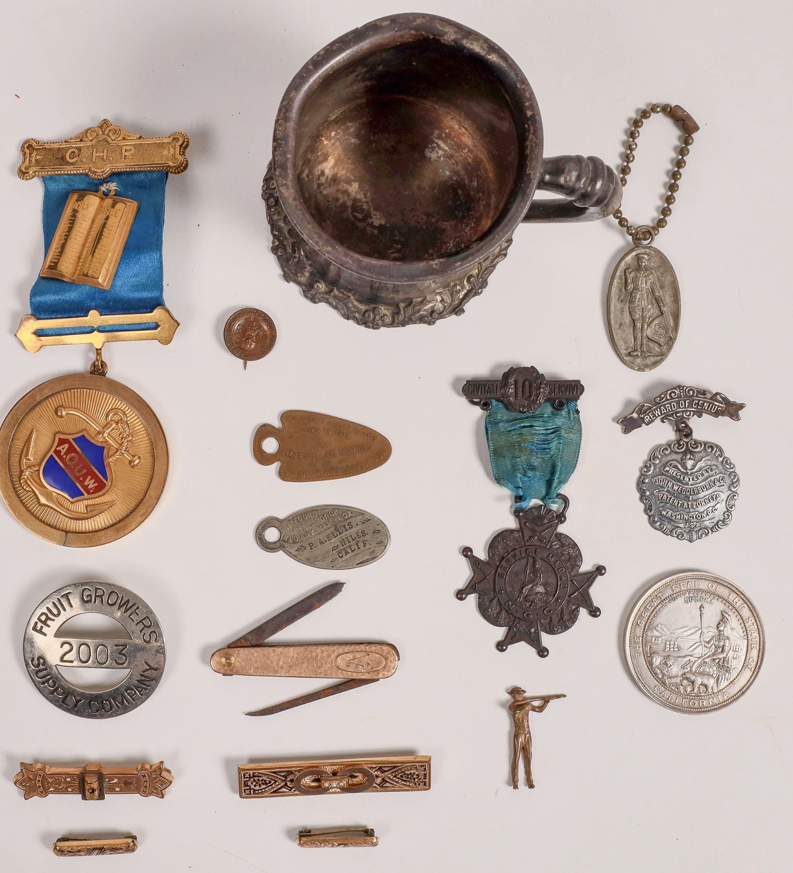 Nice mix of vintage medals with a California slant. Oval white metal Niles, Calif. Brass arrowhead shape drop in mailbox. Round pin, American Bosch Radio Explorers Club. Round white metal Fruit Growers Supply Company, c. 1937 Oregon. 1.75". 4 Victorian era gold filled pins, c. 1900, 1-2.25". White metal Hood Footwear key fob 2x.75". Silver plate cup, Baby/1906 2.5x3". Breast badge-California Nation Guard 10 Years. 1" rifleman. 2.25" folding knife with engraved A. Reward Of Genius Sterling medal. 1912 California State Agricultural Fair medal, 1.75". A O U W, San Rafael Lodge 1885 breast badge, 5.5x2".