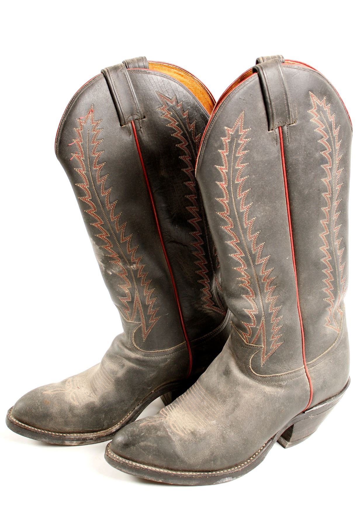 Black boots with red and brown stitch accents. Size unknown