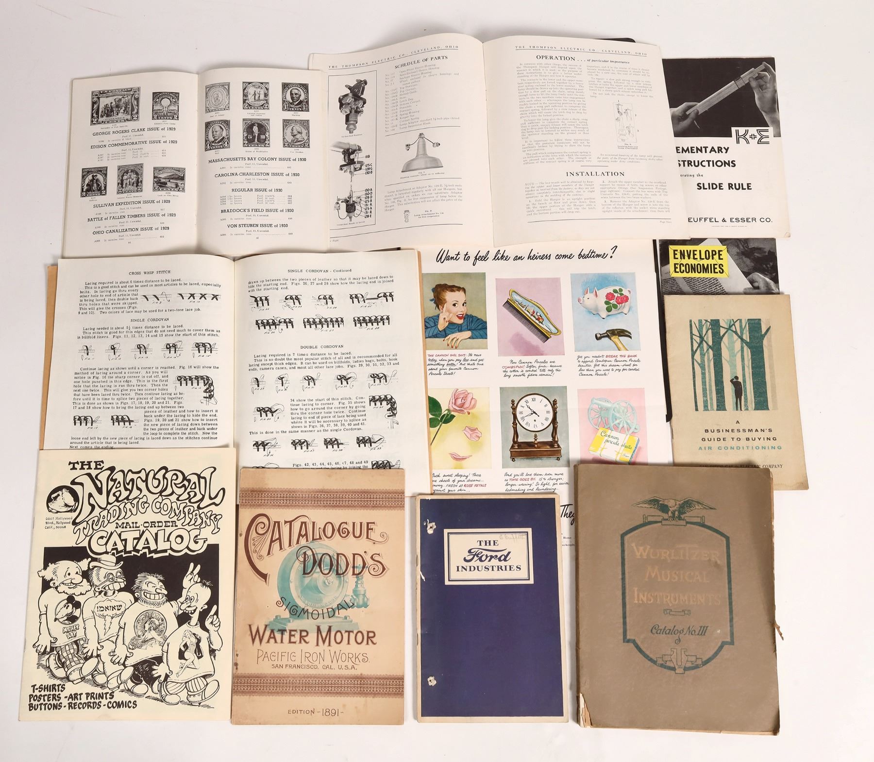 9 vintage merchandise catalogs and instruction books. A Businessman's Guide to Buying Air Conditioning. Cool 1974 Furry Freak Bros. like Natural Trading Company catalog. 1891 Dodd's Sigmoidal Water Works catalog. 1925 The Ford Industries-2 punched holes. c. 1917 Wurlitzer Musical Instruments catalog-detached cover. Original typed manuscript for Cannon Mills Co. for colored sheets advertising campaign, no date. Scott stamp catalog 1938. Thompson Lamp Lowering Hanger catalog, 1936 and more.