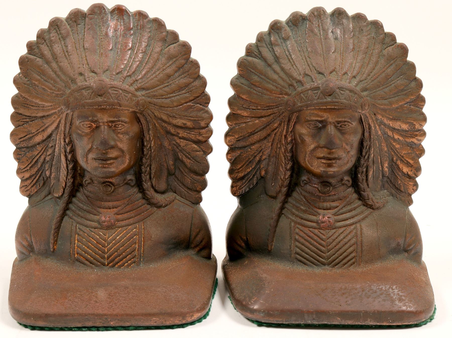 Pair of metal solid or plated copper Indian Chief bookends. Traces of gilding on breastplate. 6.25x4.25"