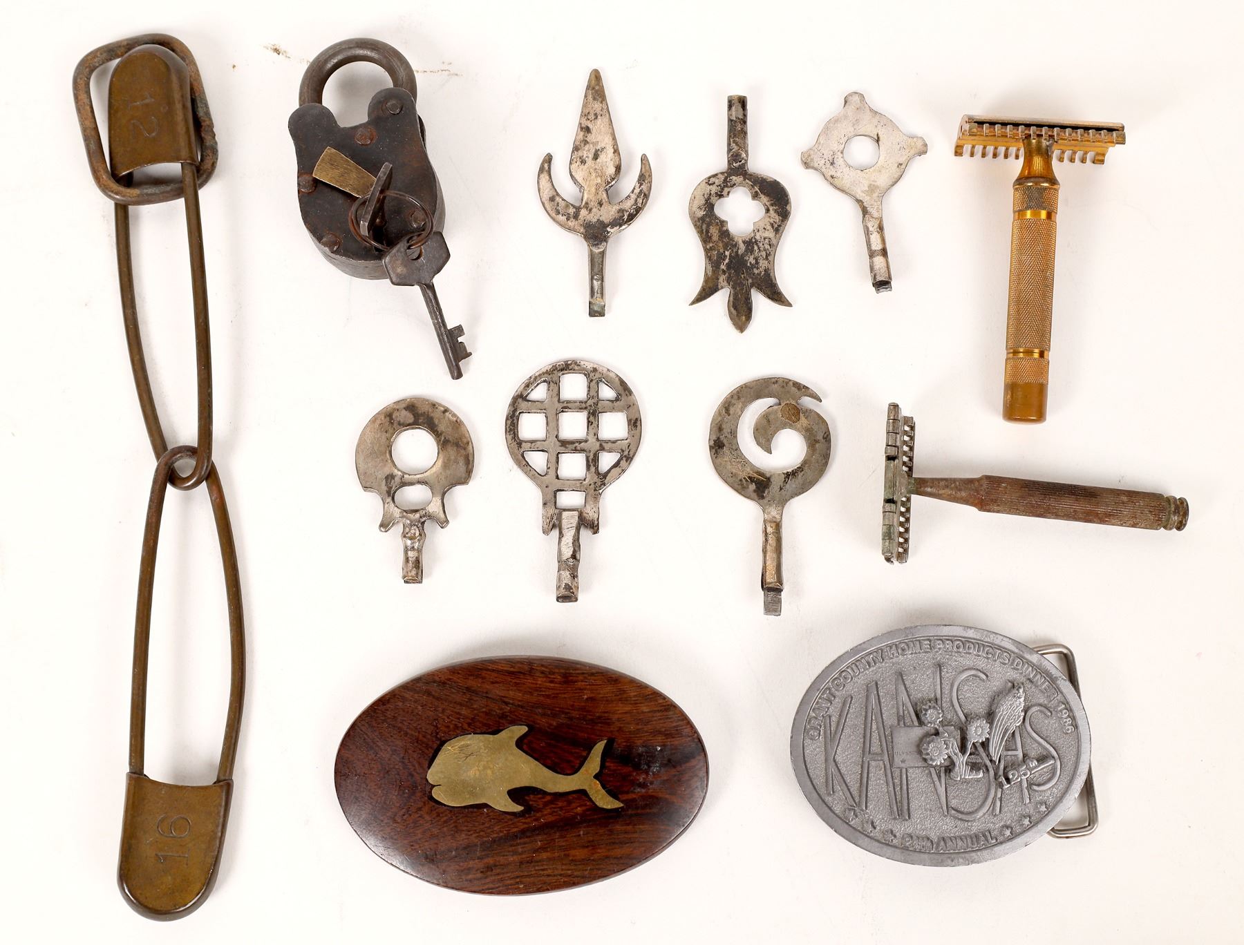 Old lock and key; large safety pins; two belt buckles (wooden whale; Kansas); two vintage safety razors; six vintage keys.