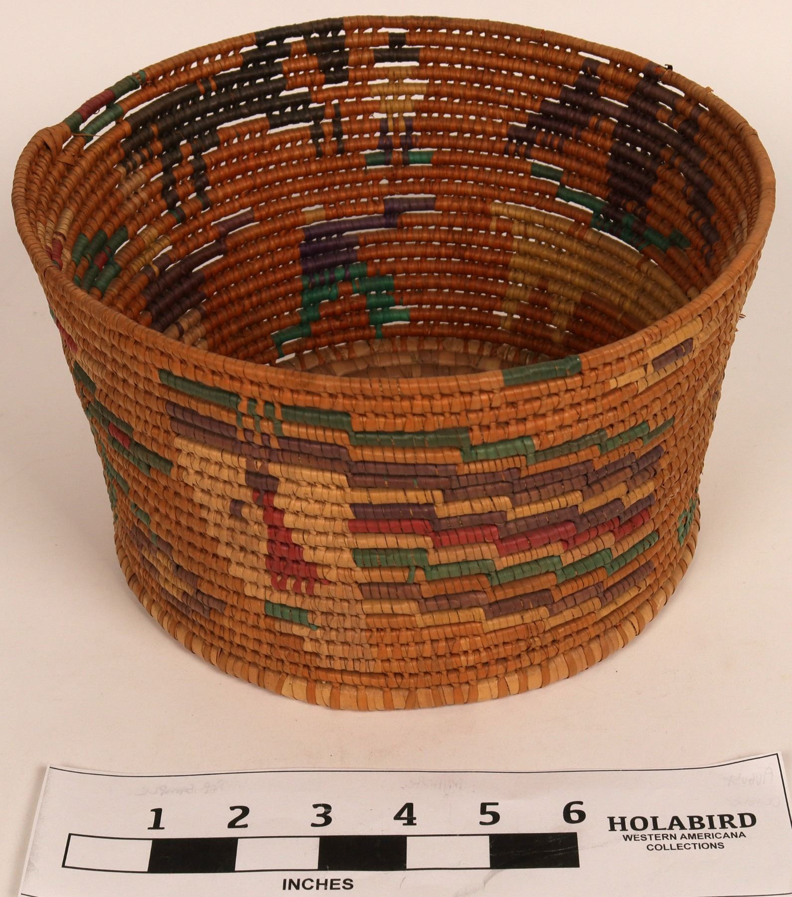 Vintage Mexican Toluca Valley Hand Dyed 4 color coiled polychrome figural basket This basket is most likely from the 1930's to 1940's. 9.25" diameter x 5.75" high. Very good condition.