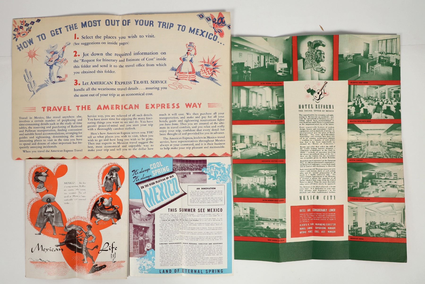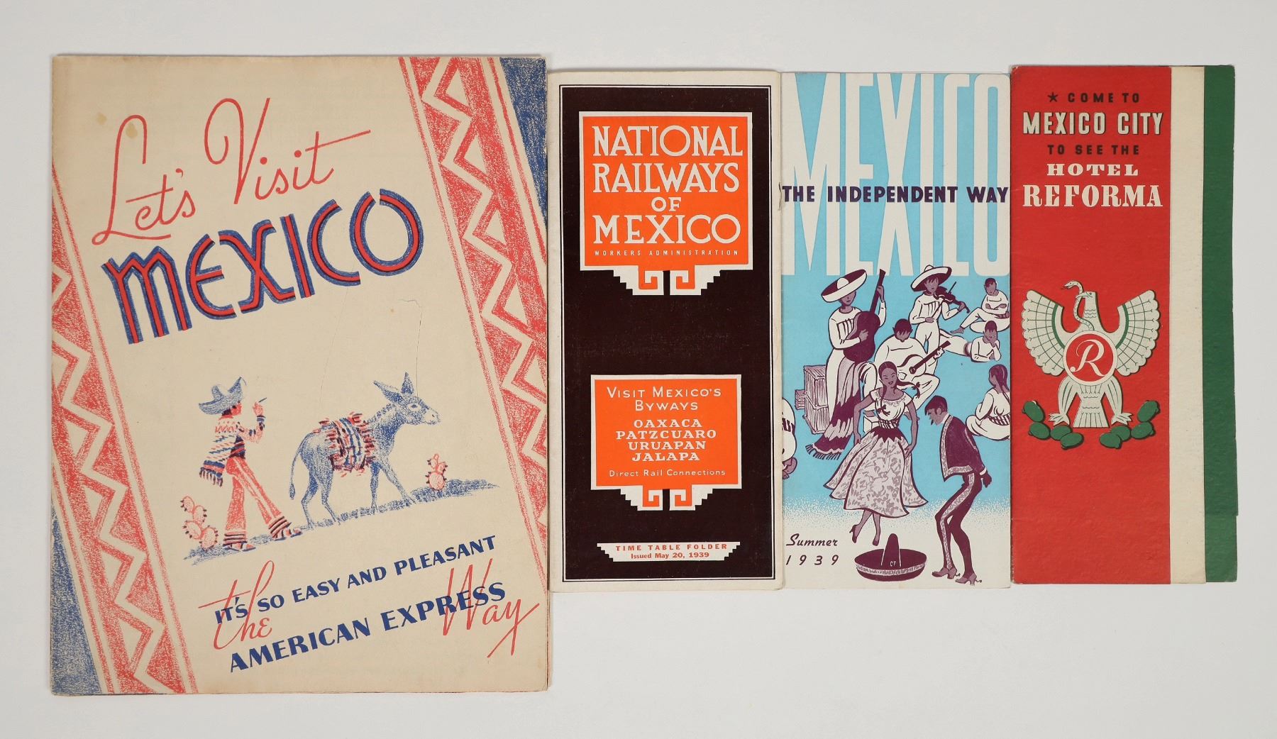 Group of 4 vintage travel brochures encouraging tourists to visit Mexico, all dated c. 1939. Lot includes a rail brochure of train tours and schedules; a hotel info booklet; a map of Mexico; and a promotional booklet from American Express aimed at travelers. All 4 pieces are in good condition, with nice unfaded color.