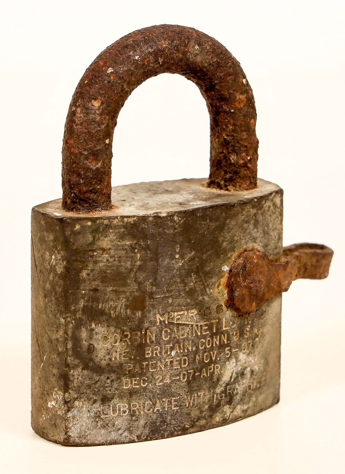 Vintage Corbin Cabinet Lock Co., Britain, Conn., brass padlock with 1909 patent. Military lock engraved, "Ordnance Department U.S.A." on front. Probably from the WWII era. Some corrosion on shackle and side clip. Unusable - won't open.