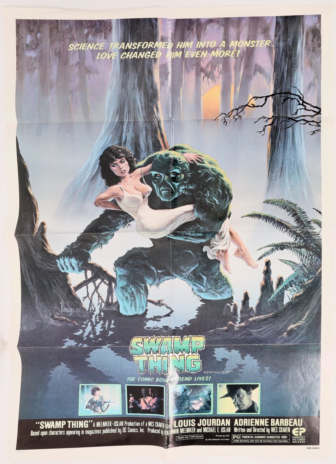 Group of seven vintage one sheet movie posters for the following films: Swamp Thing (1982), Dead Men Don't Wear Plaid (1982), The House by the Lake (1976), Top Secret Affair (1957), Carolina Cannonball (1955), and Barnacle Bill (1941). These posters are all printed in color. The average size of these movies posters is about 27 x 40. Mostly good condition, some are fragile and may be torn around the edges and fold creases.