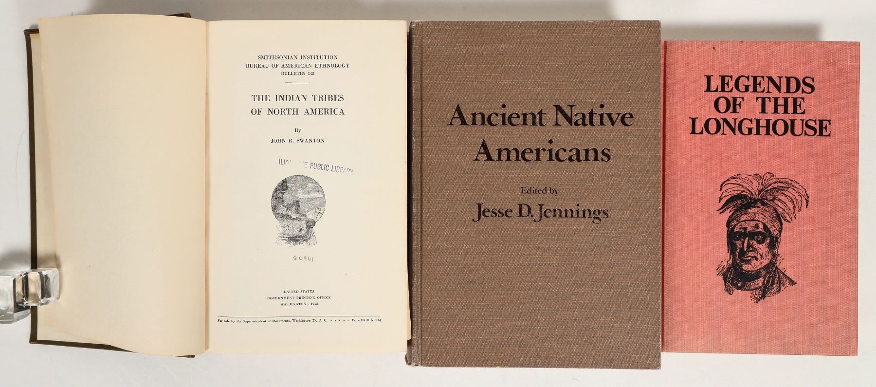 Group of 3 books on Native American topics, published 1938-1978. Titles include "Ancient Native Americans" by Jesse Jennings; "The Indian Tribes of North America" by John Swanton; and "Legends of the Longhouse" by Jesse Cornplanter, a notable Seneca chieftain. "Ancient Native Americans" and "Legends of the Longhouse" are both in good condition, "Indian Tribes" has some notable wear and spine separation. It also has a bookplate from the library of Clarence Seamans, a notable typewriter manufacturer. See photos for detail.
