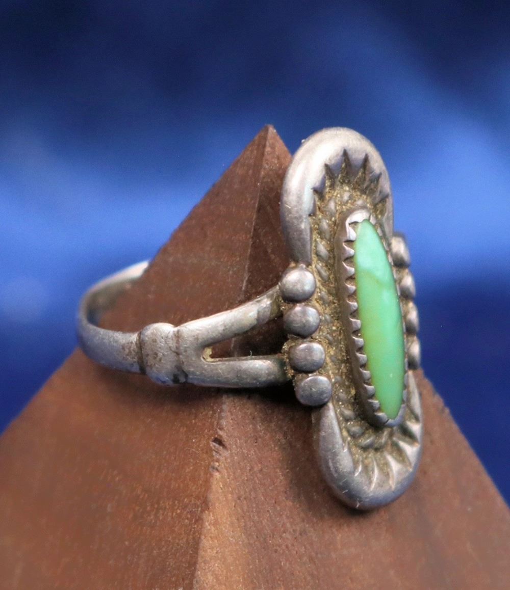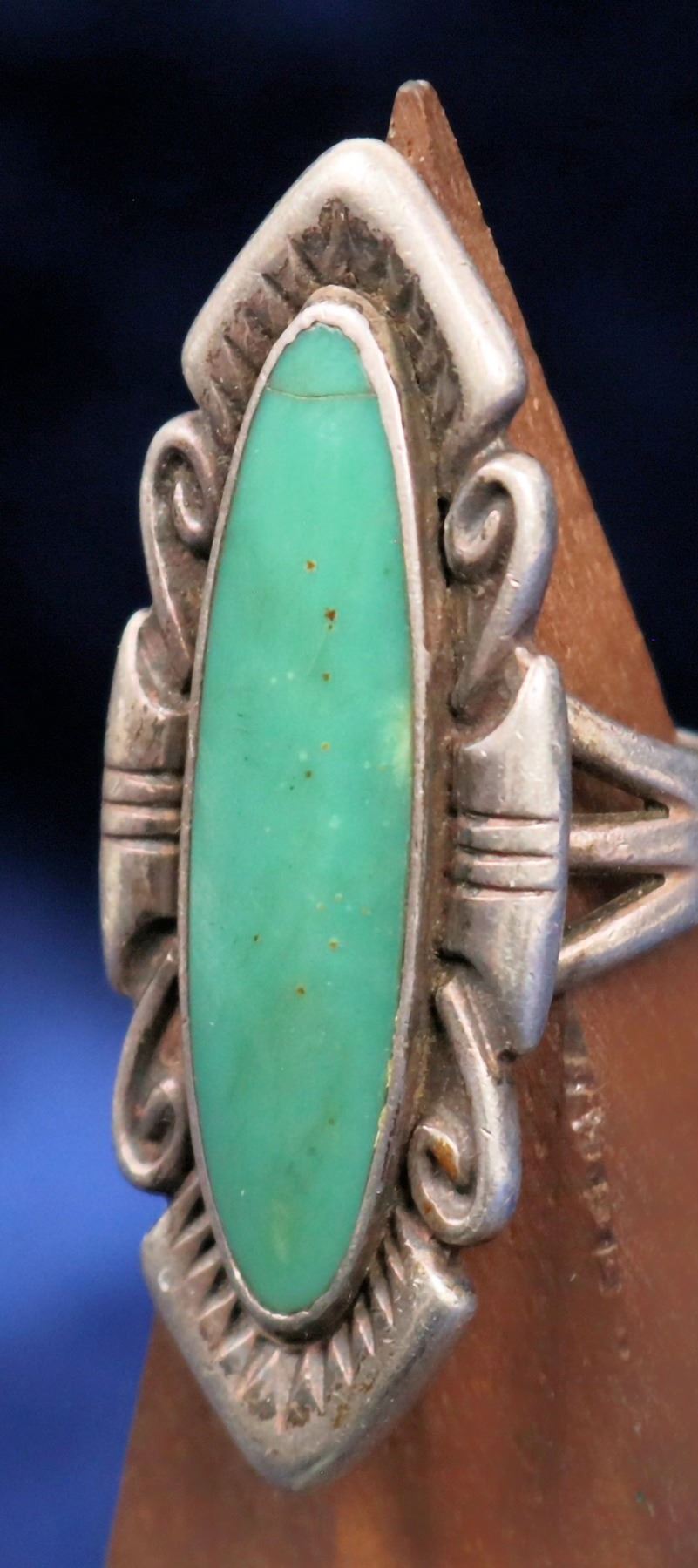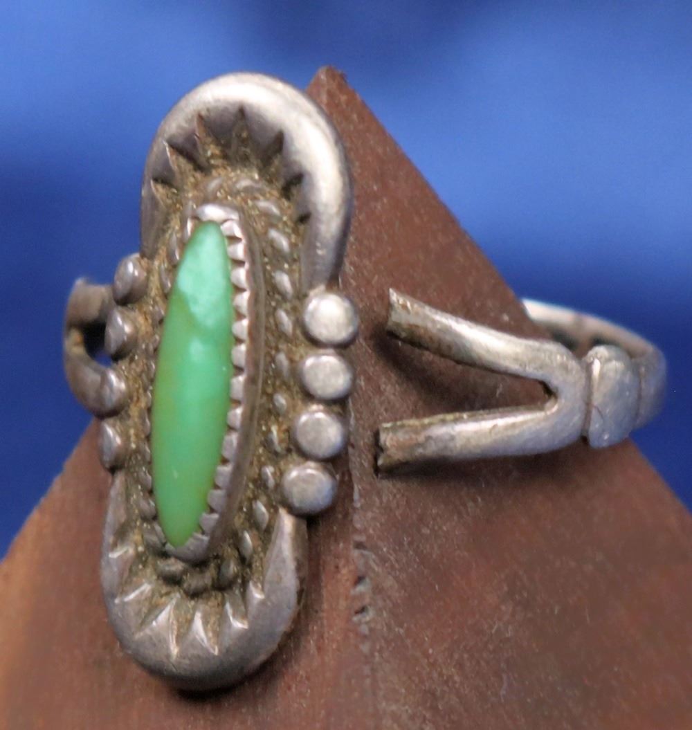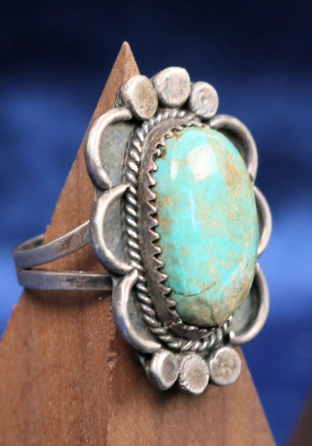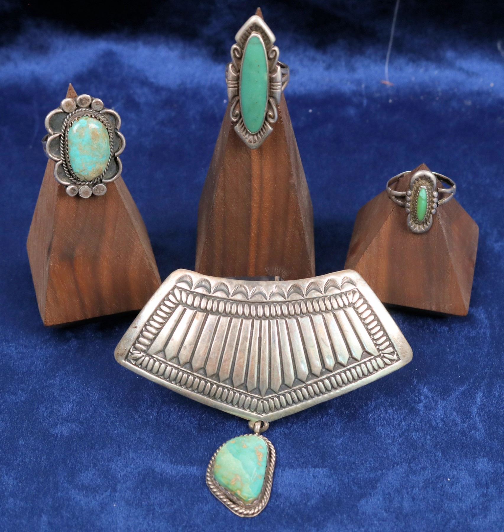 Sterling vintage eagle feather design brooch with hanging turquoise stone, possibly Dakota Sky. Also, 3 Navajo rings--each set with turquoise stone. Please inspect.