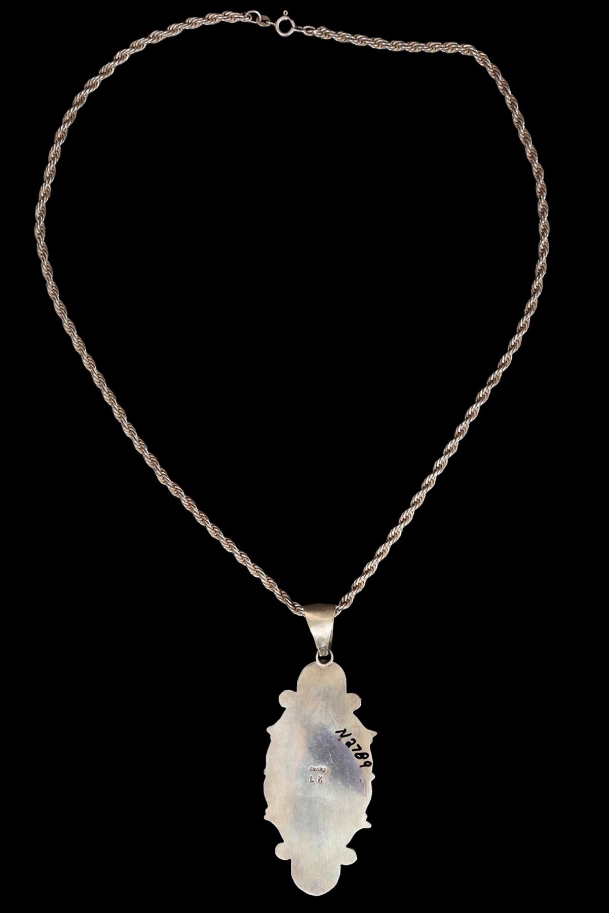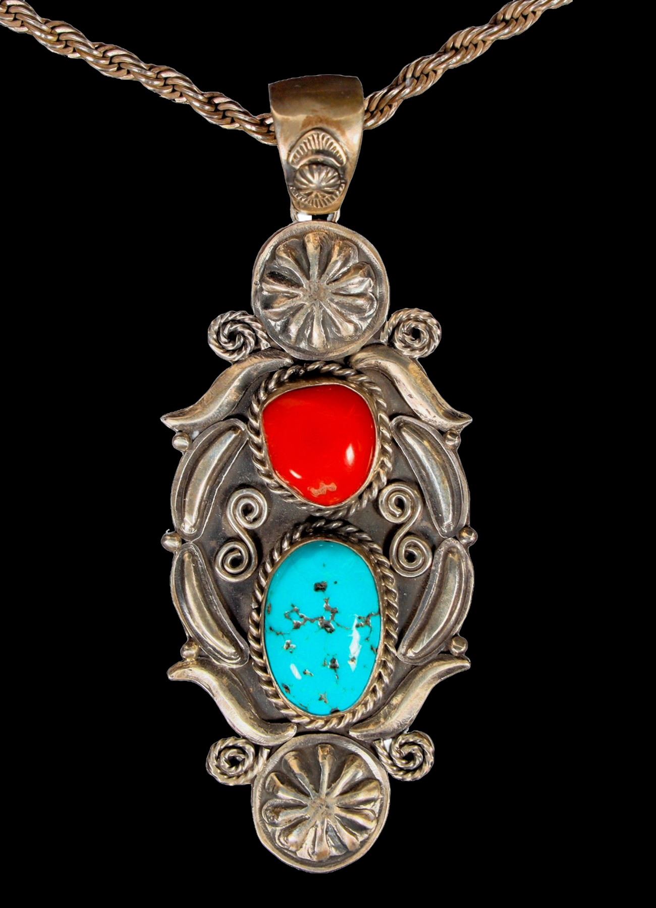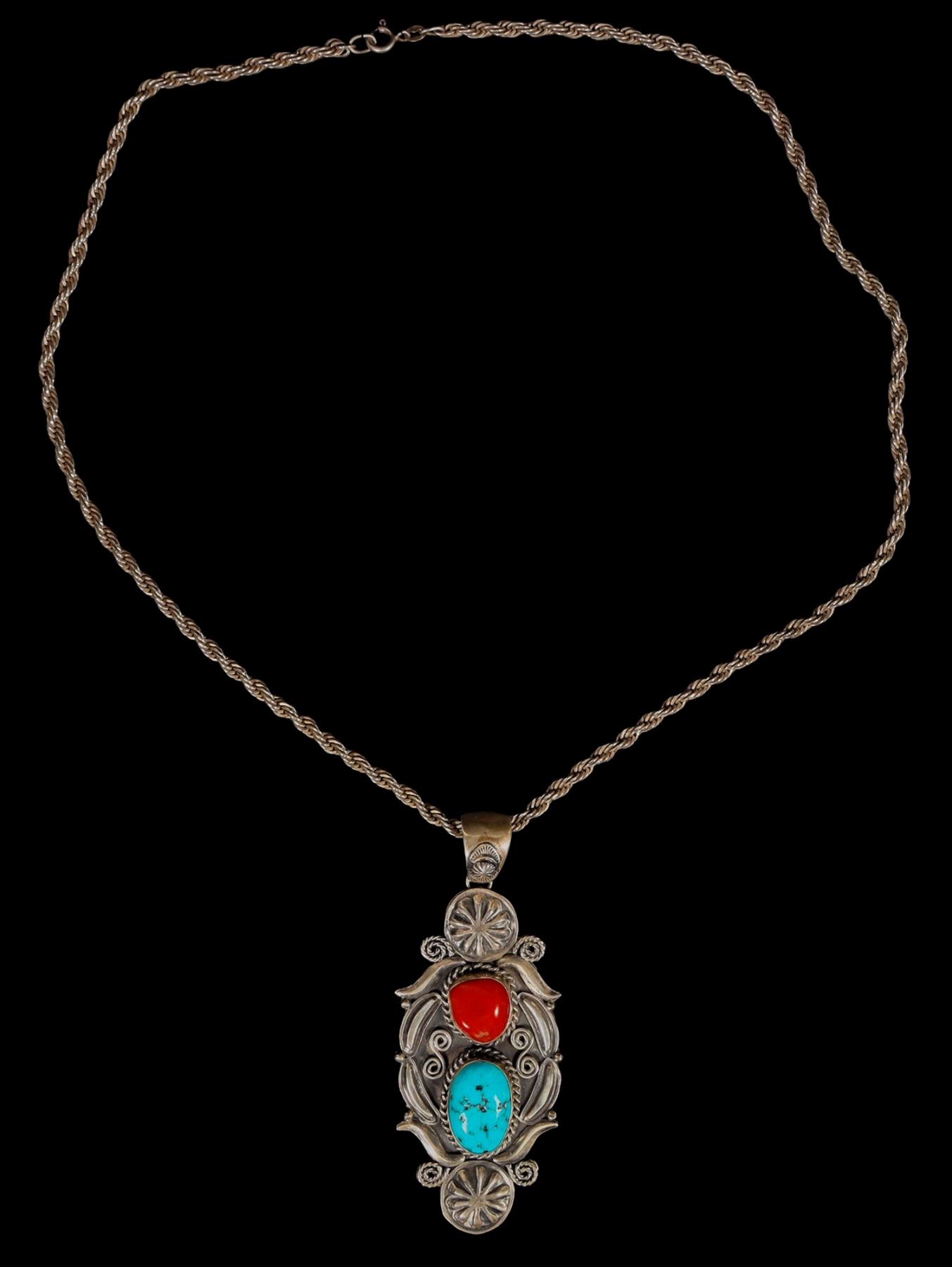 Vintage Navajo pendant with a coral and turquoise stone set on a sterling silver rope and floral background, pendant is 3" tall by 1 1/2 " across, Navajo made and signed with an LK hallmark.