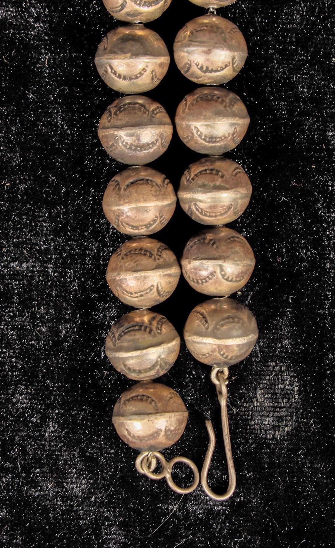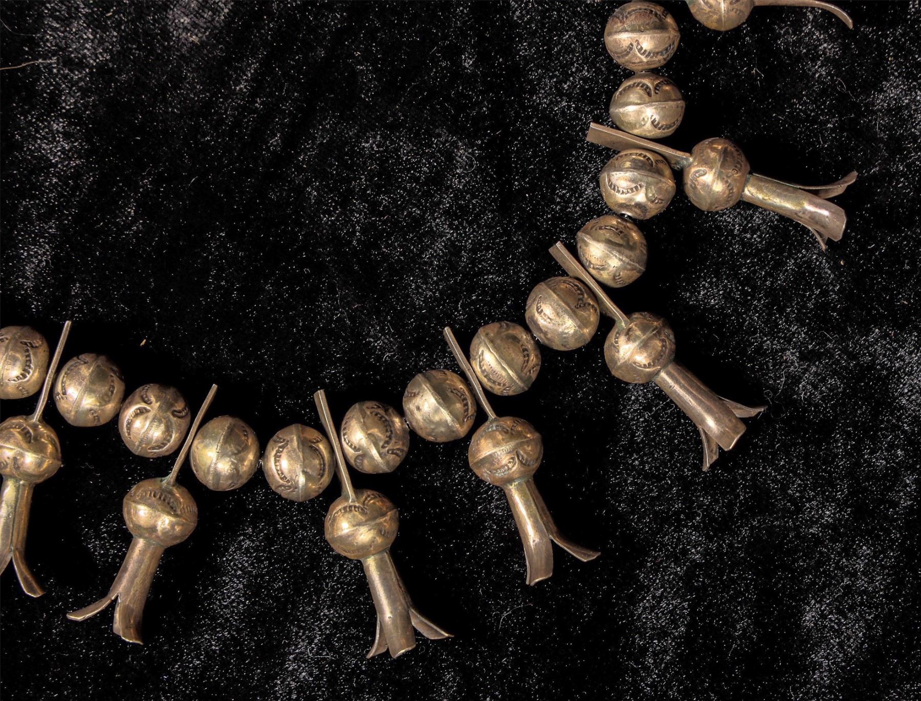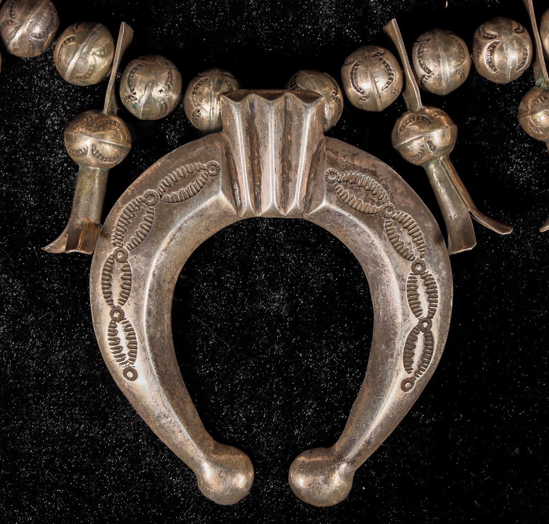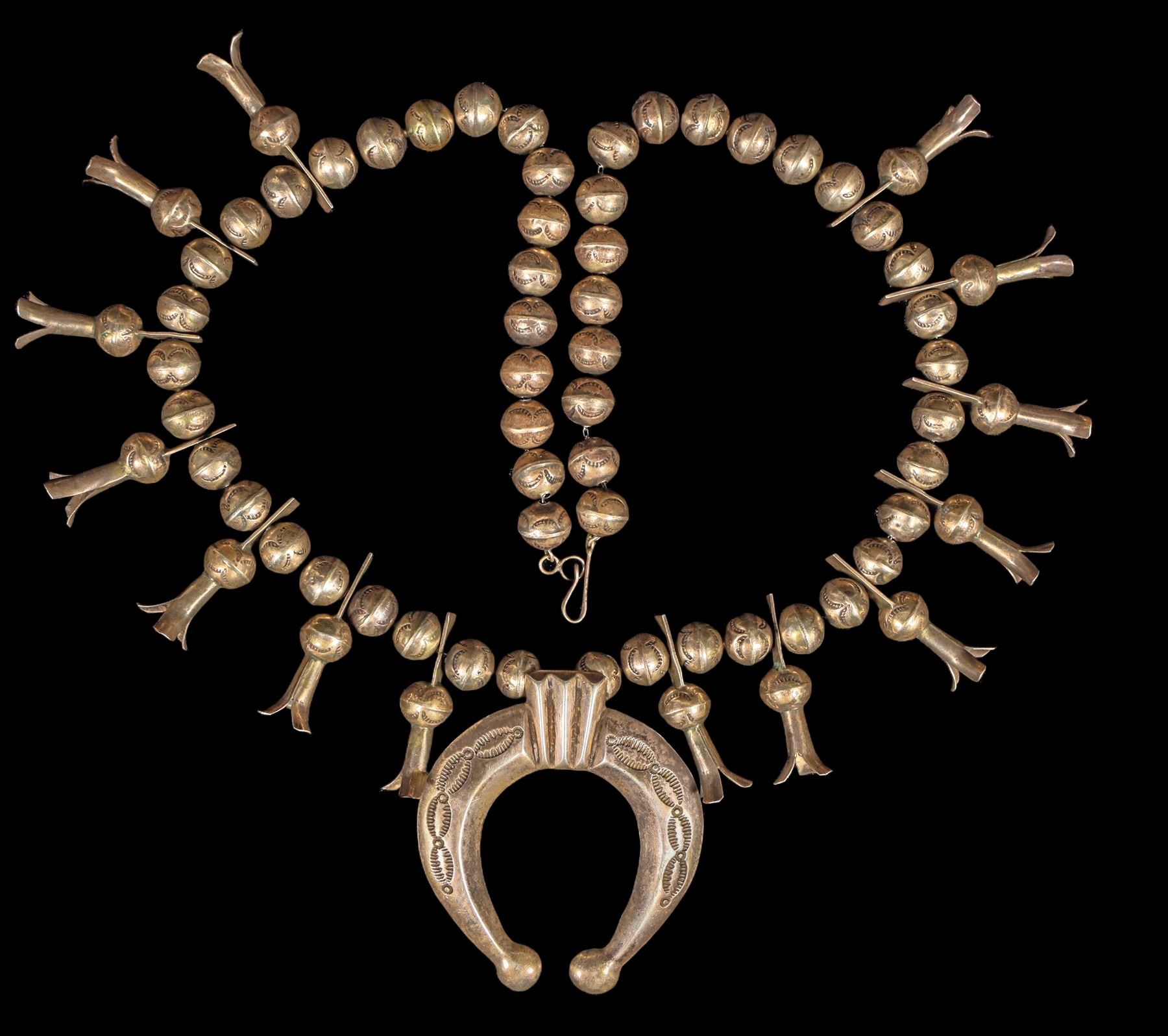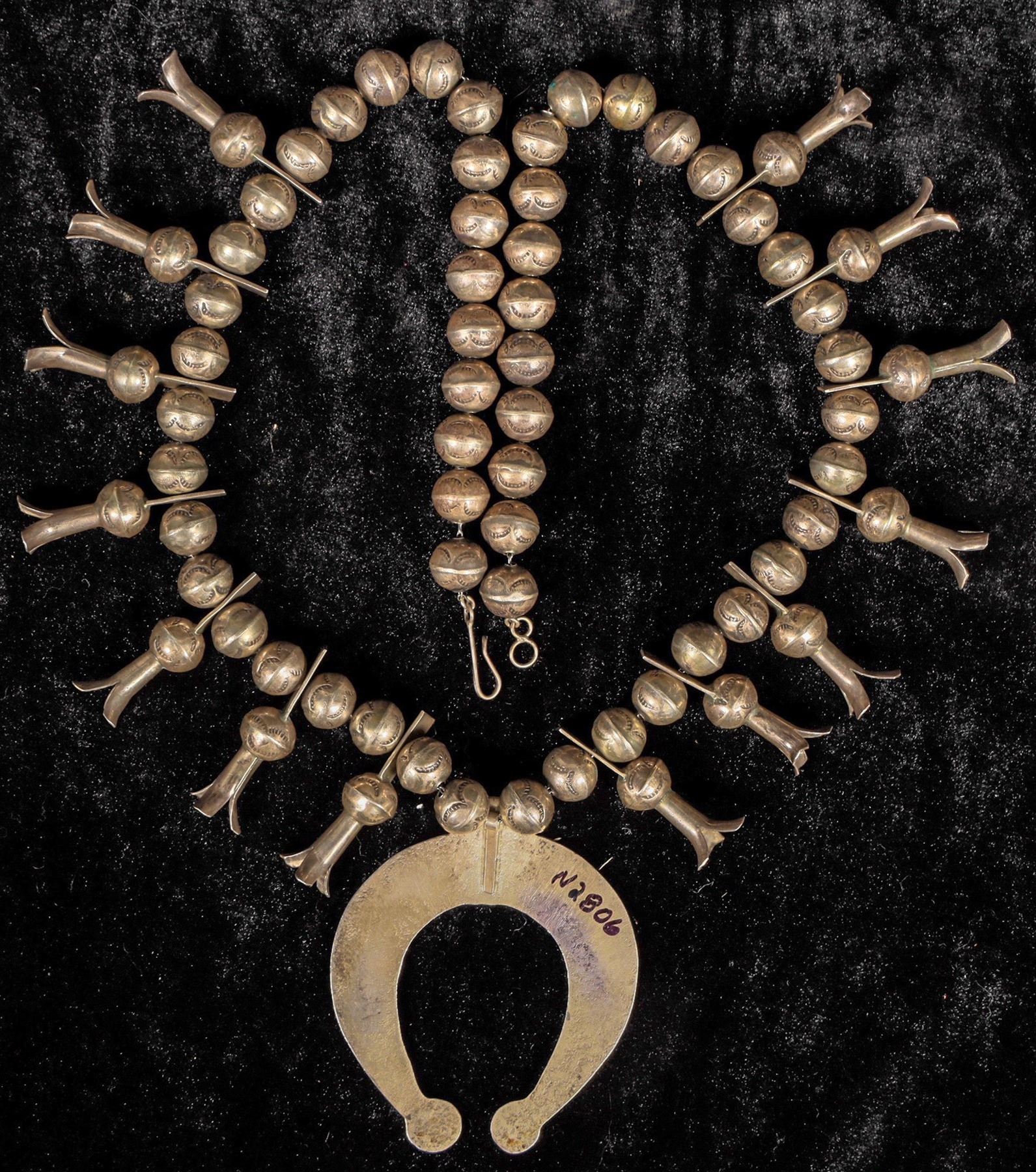 This is a great example of an early Navajo made Squash blossom c. late 1800's early 1900's with an outstanding patina showing on the entire piece, top to bottom measures at about 15", there is no hallmark which is not unusual for earlier pieces since many silversmiths were simply not signing there work at that time, all the silver beads carry a stamped pattern.