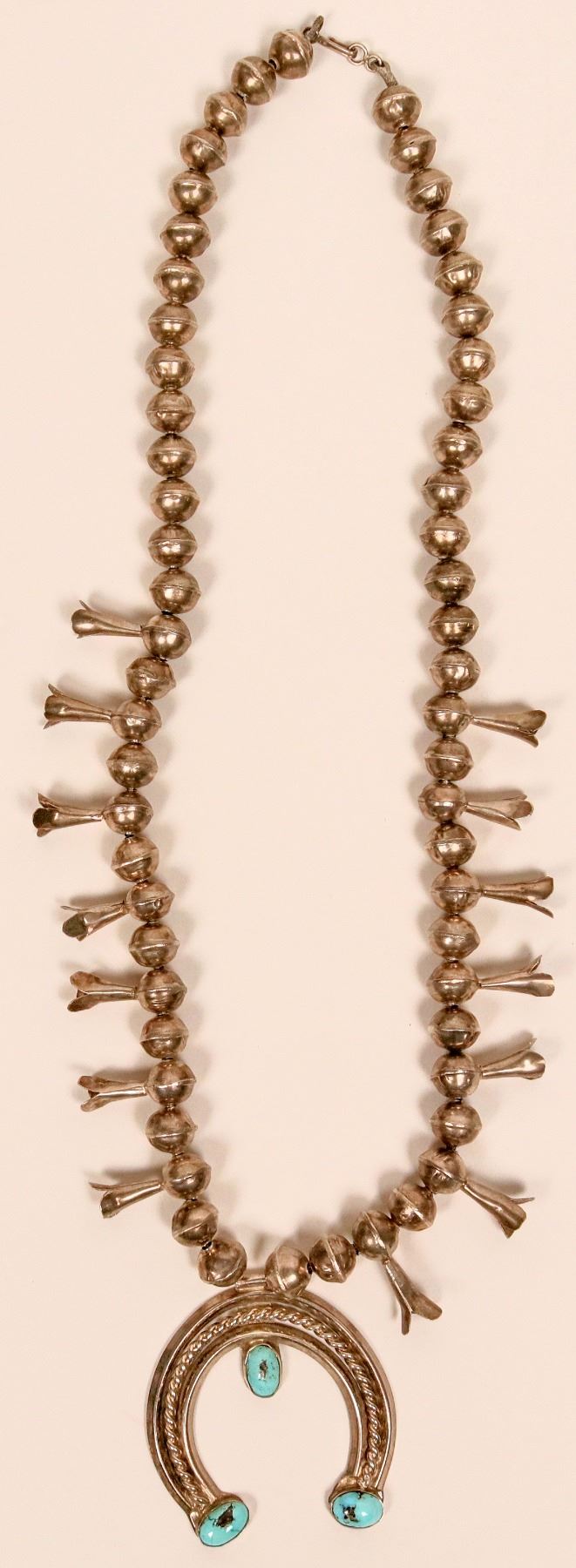 This Navajo Squash blossom has really nicely aged silver beads and a naja with three small turquoise nuggets. This is an unmarked piece measuring 15” top to bottom.