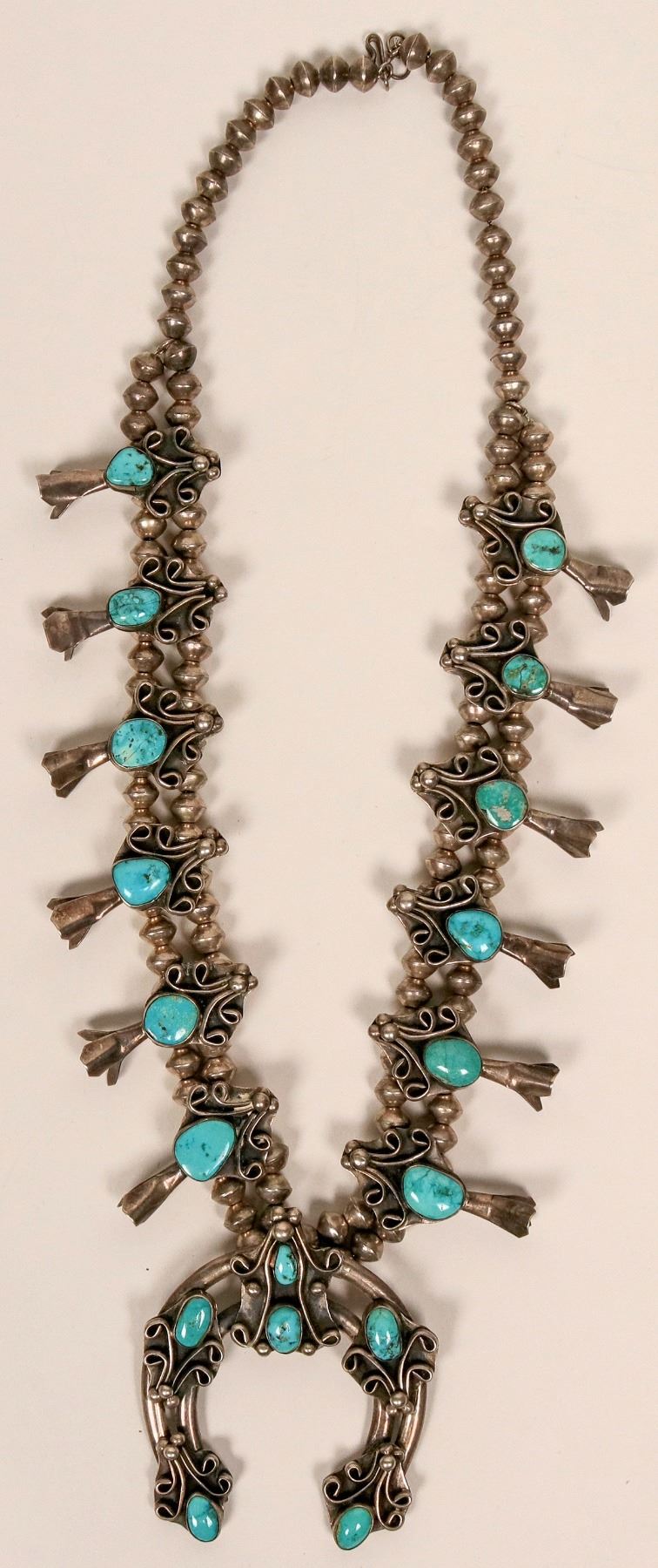 Great older Navajo turquoise squash blossom, looks to be around 1950’s to 1960’ piece,a nice patina has built up on all the silver, the naja is about 3-1/4” tall by 2-3/4” across with six beautiful turquoise nuggets, this is an unmarked piece measuring at about 15-1/2” top to bottom.