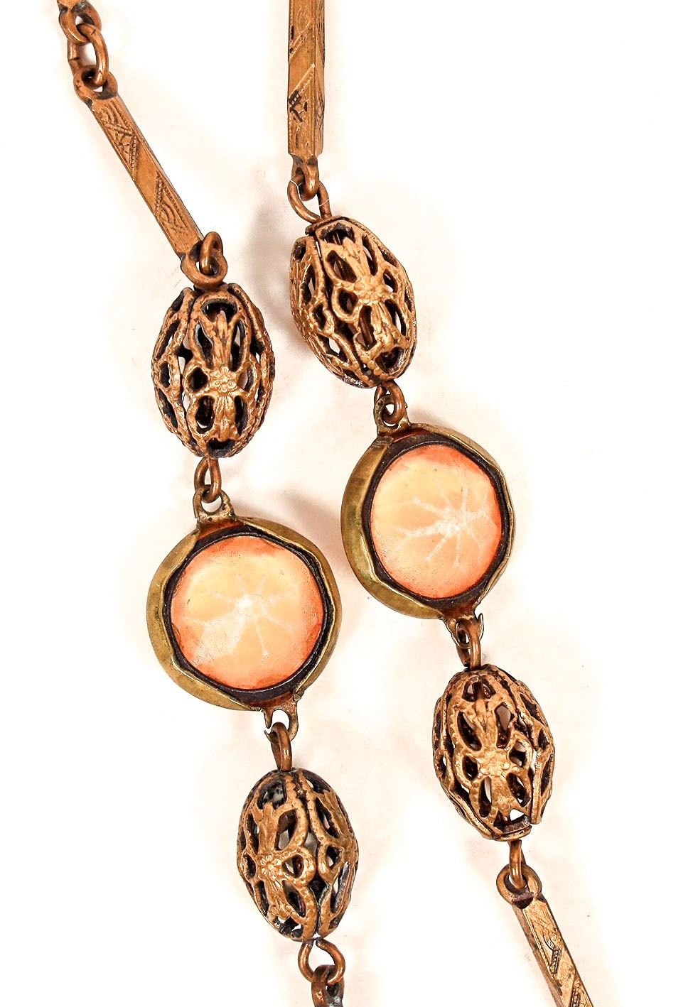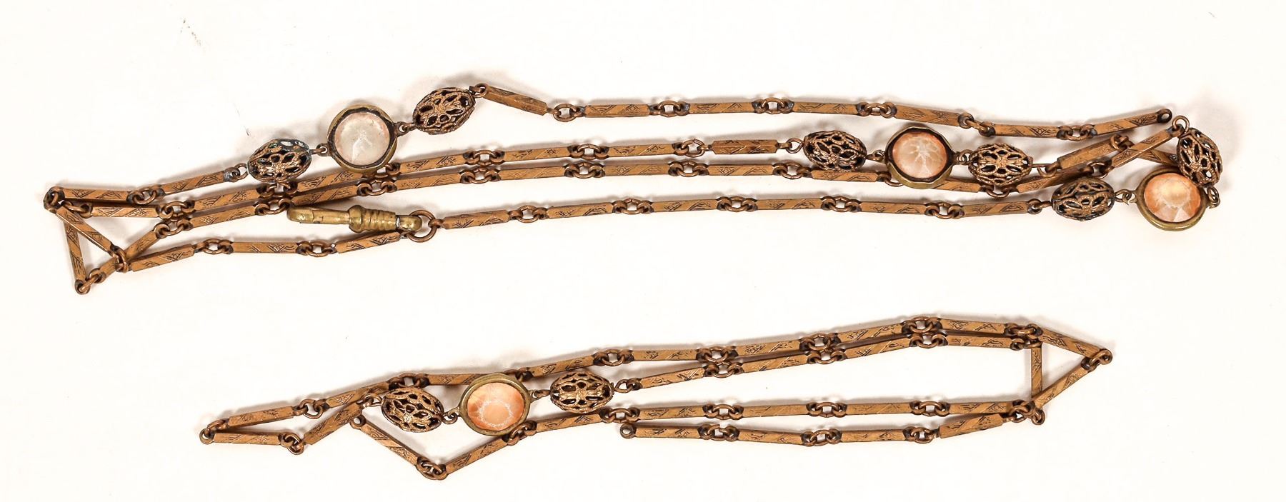 A 54" vintage chain necklace. It has white stones for accent. The clasp is missing but is an easy replacement. In decent condition. Please see photos for more details.