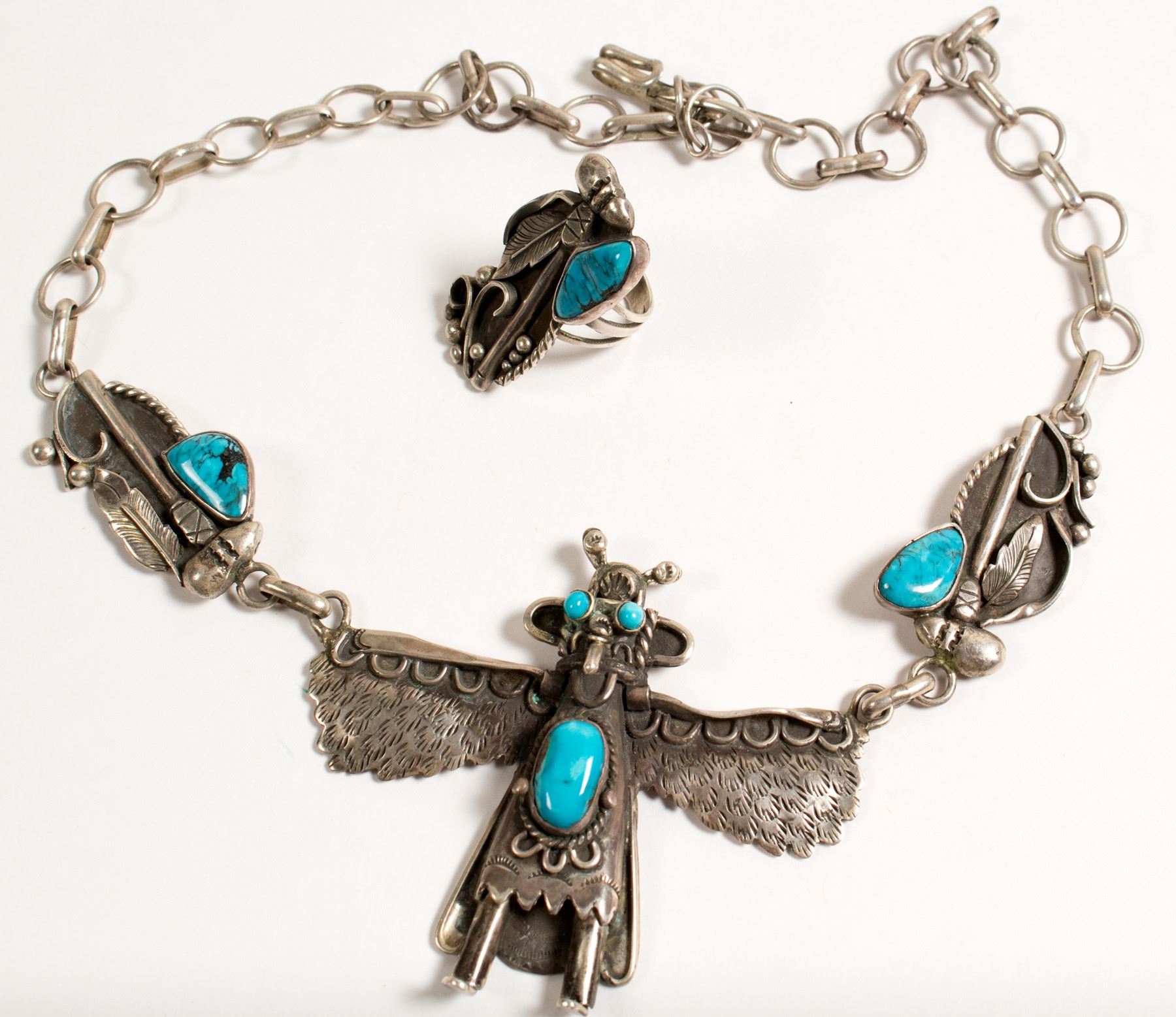 Vintage signed Native American Navajo Kachina necklace--21". Sterling silver handmade decorative chain turquoise figural pendant (3" x 3.5") and side pieces (1.75" x 1"). Absolutely incredible!!! Ring--1.5" x .75", (size 7.5) is the same design as side pieces to pendant. Beautiful vintage set. State:Arizona/New Mexico City: Date: ID# 48041