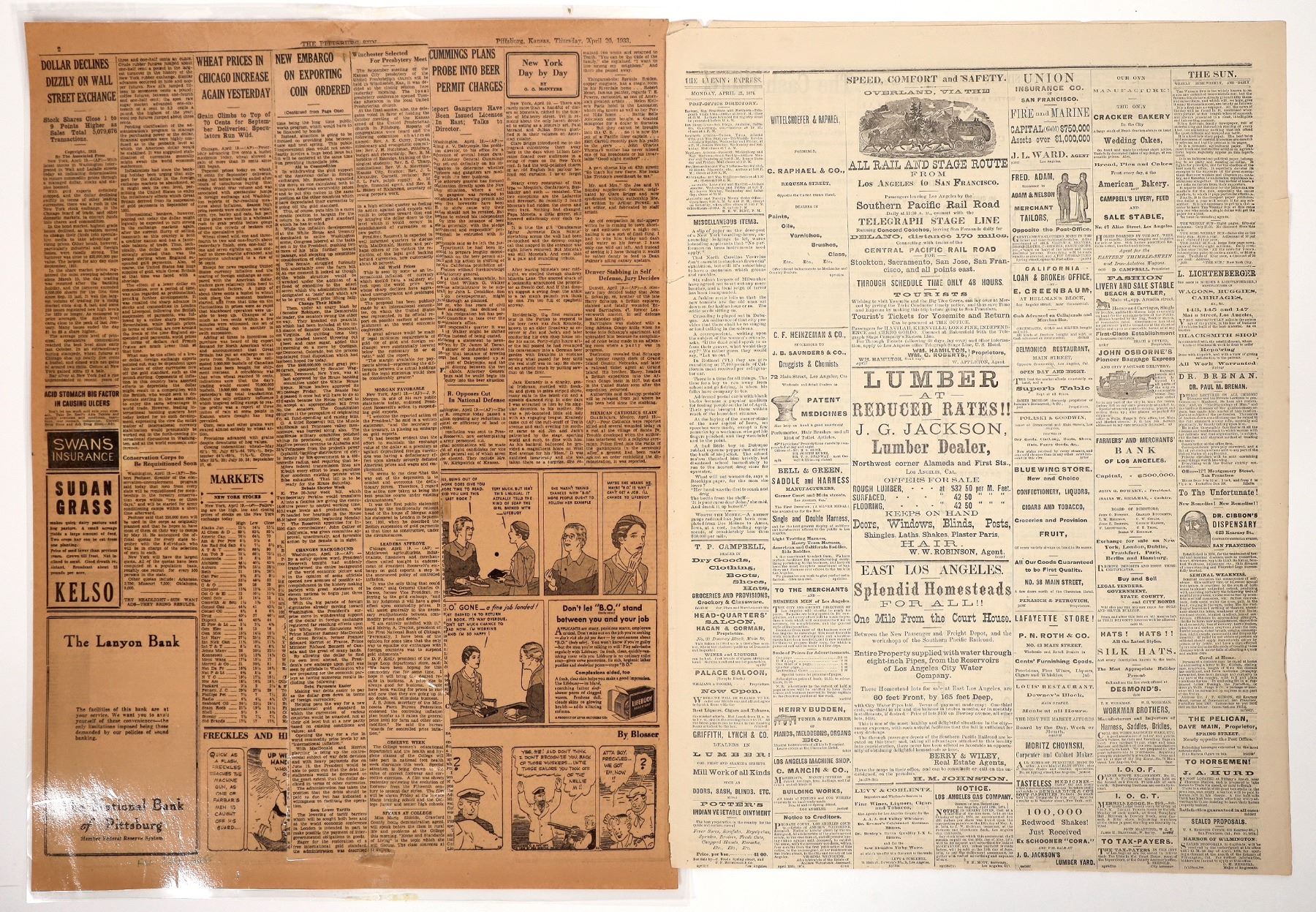 Two vintage newspaper pages. First, is from the Evening Express of Los Angeles, dated Monday, April 27, 1874. It's from an inside section and features several ads pushing everything from furniture to ales and porters. There's also an announced Sheriff's Sale.