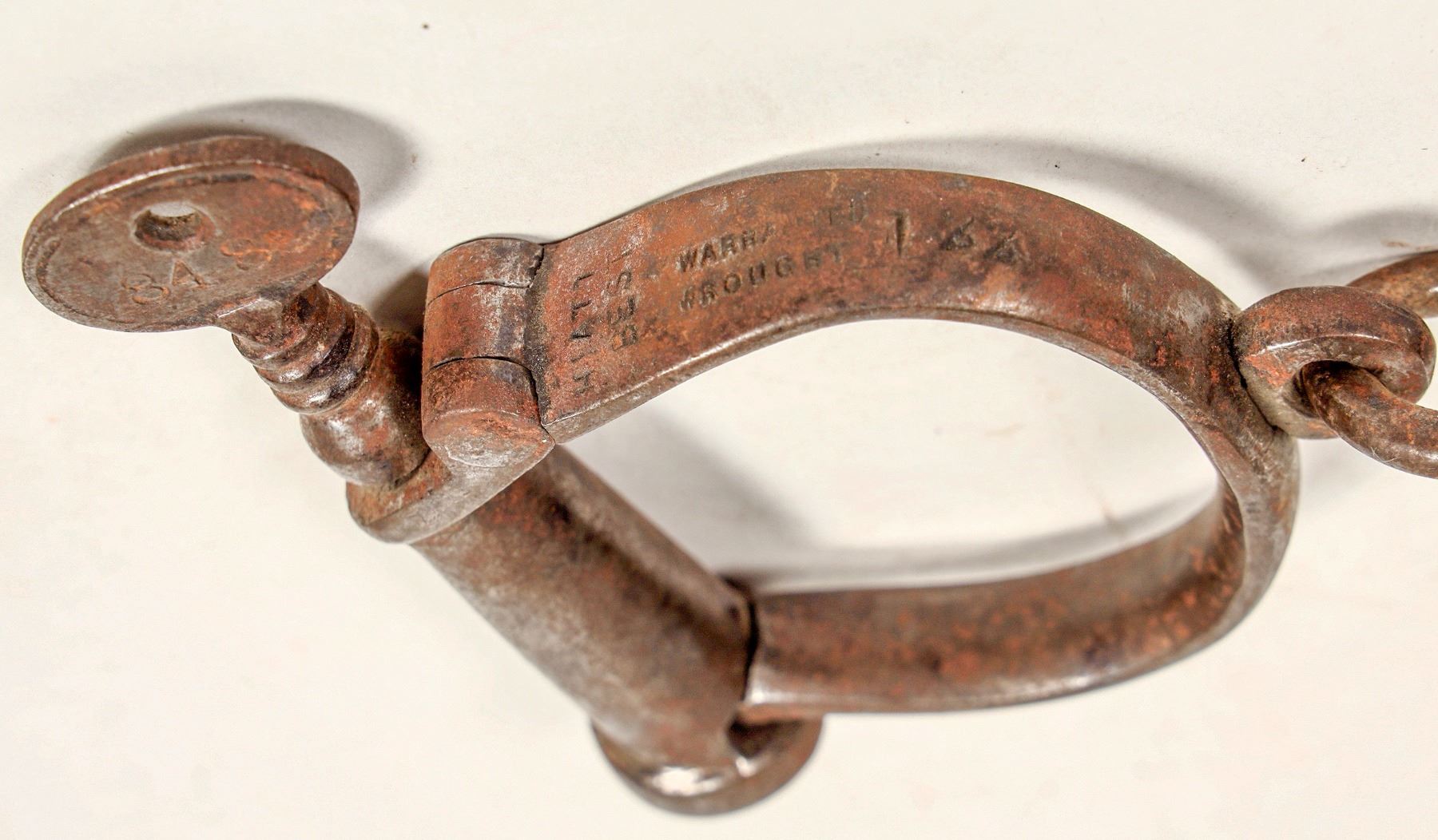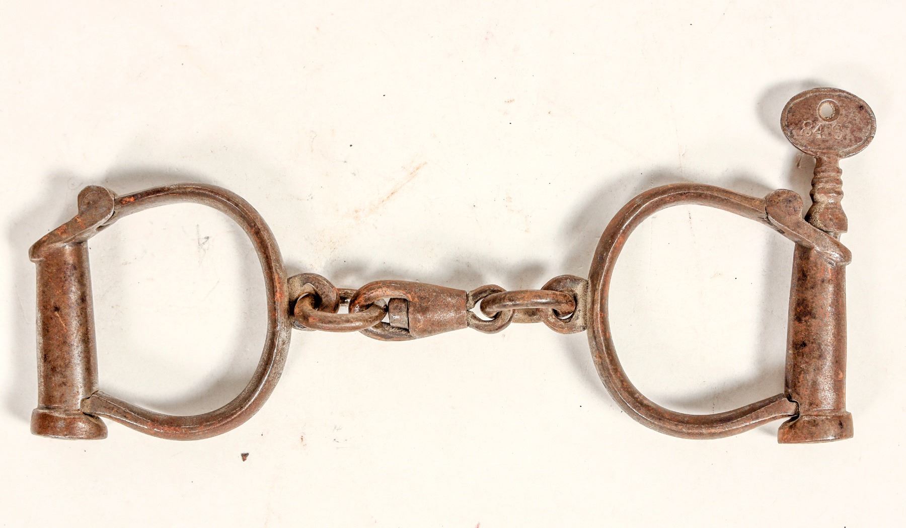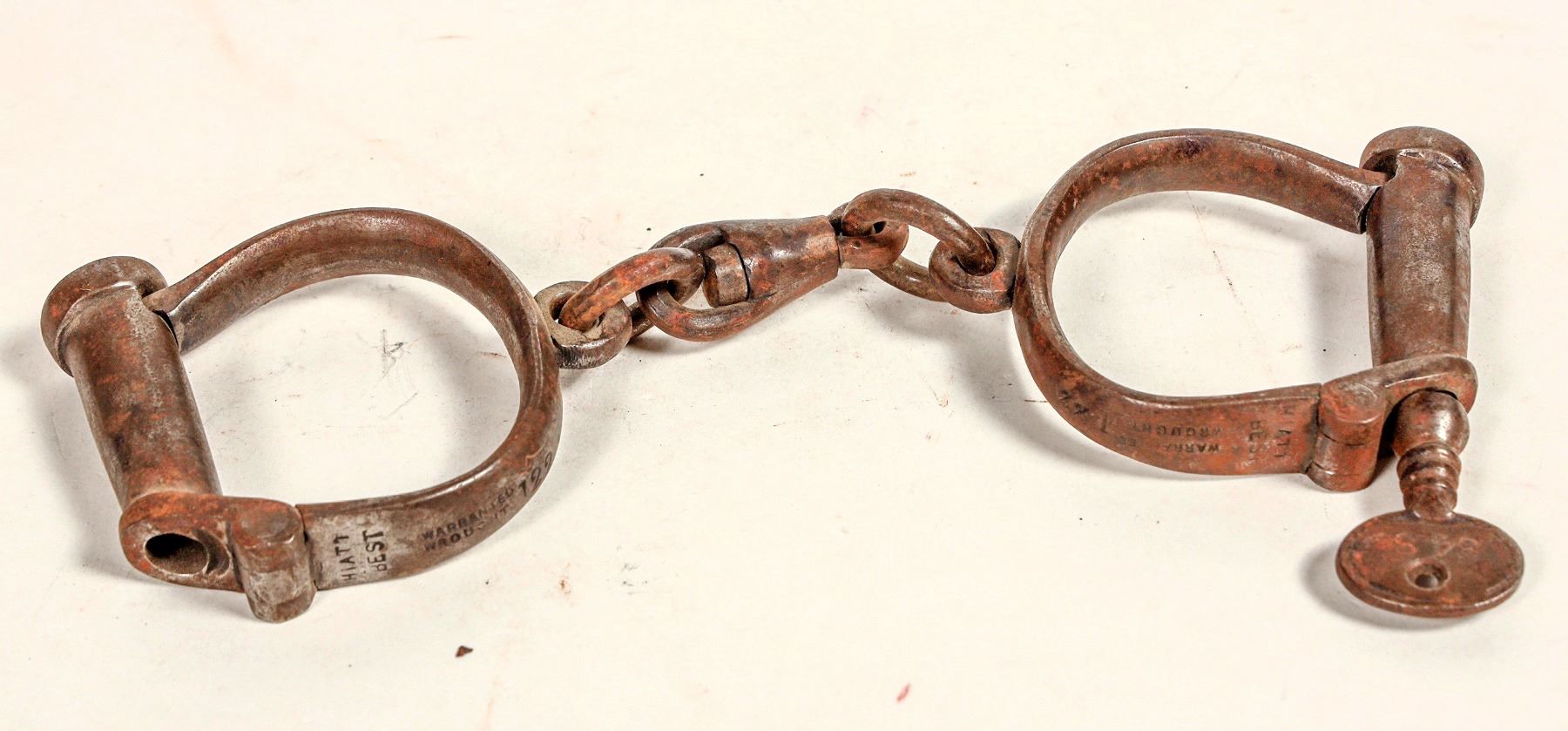 One pair Hiatt Best handcuffs w/key. In good operable cond. Stamped C.A./S.A.C.-06