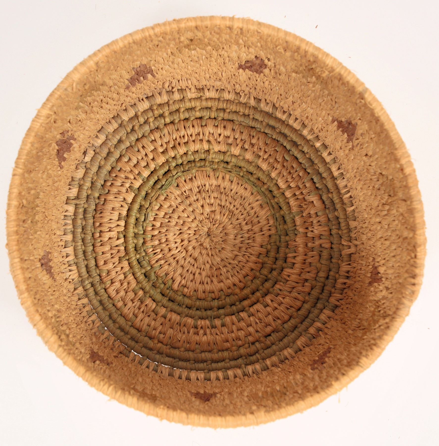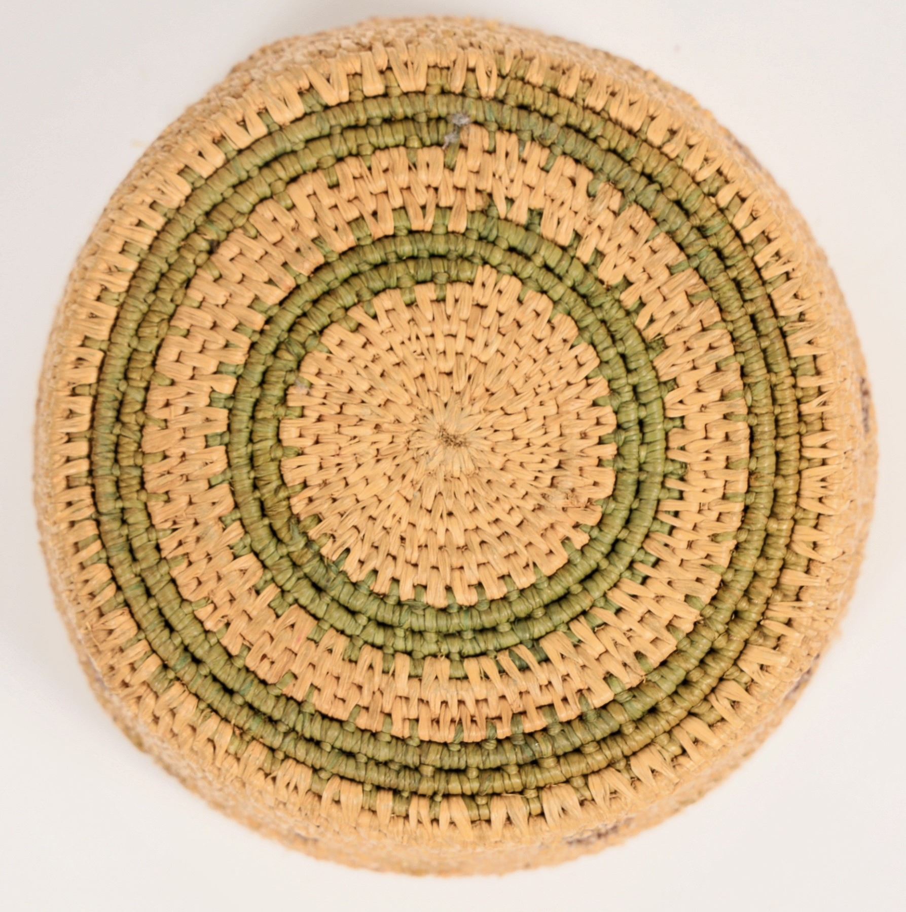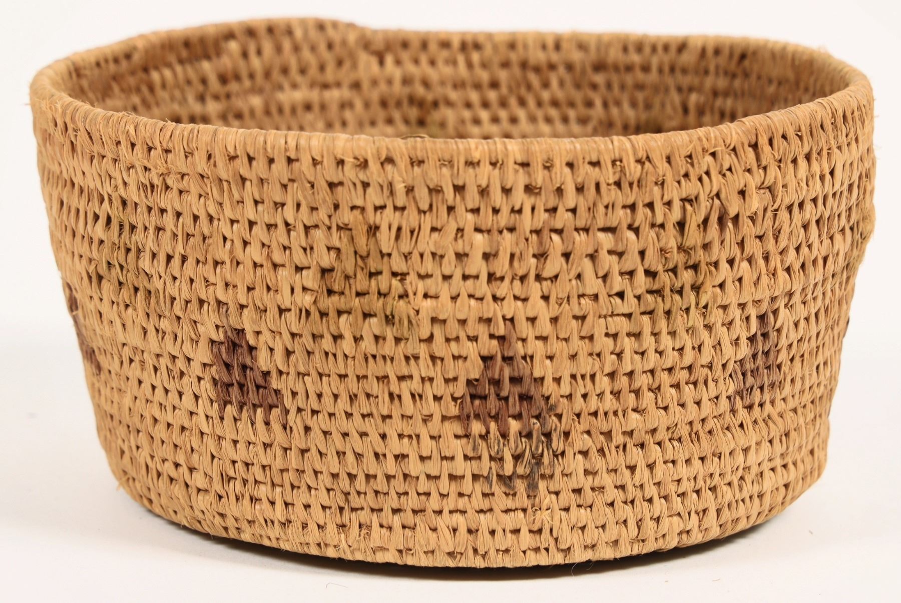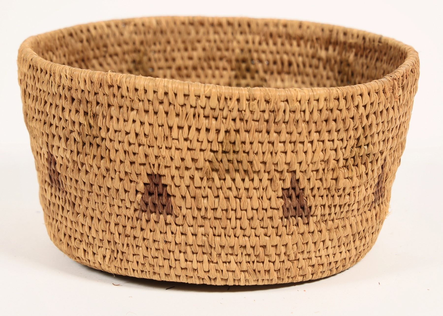Small, simple basket with triangle designs. Good condition, parts of design are faded. 5.75" diameter, 2-5/8" high. See photo.