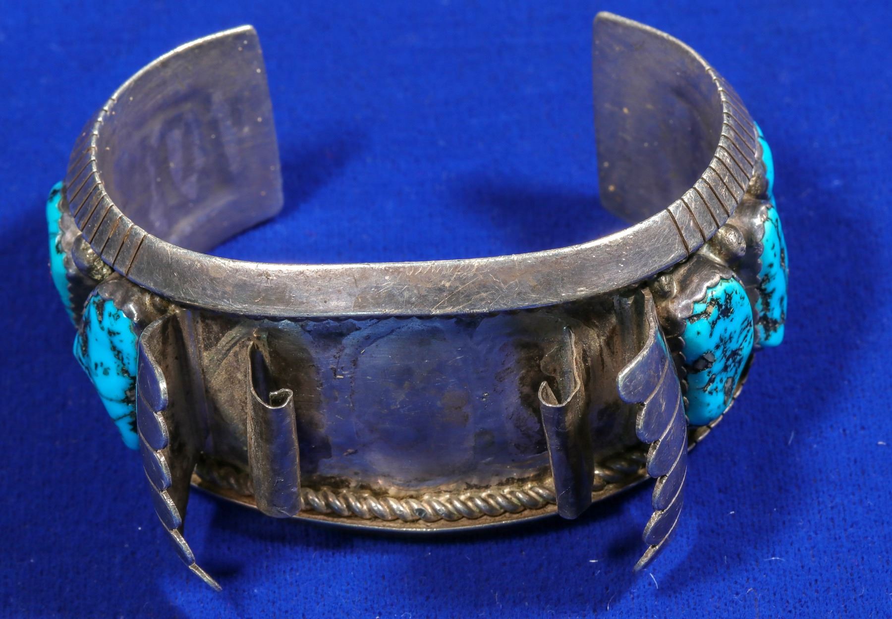 Heavy sterling watch bracelet/band. Set with 8 turquoise natural cabochons, wrapped wire, shadowbox style. Inside is scratched "Ramiro". Measures 5.5 inches inside with 1.5-inch gap. Weighs 941g.