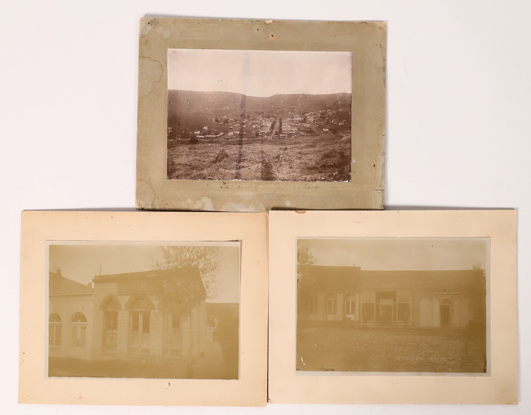 Three vintage photos from Virginia City, Montana Territory: 1) Henry Elling bank building (1870-1930s) upper North Wallace Street; 9 x 7 inch matting. 2) Birds eye view of Virginia City, on the back is written: Mr. Frank Jackson, Sr; 9 x 7 inch matting. 3) S. R. Buford store featuring Mitchell Wagons, three gentlemen on the sidewalk; 9 x 7 inch matting. Virginia City Montana