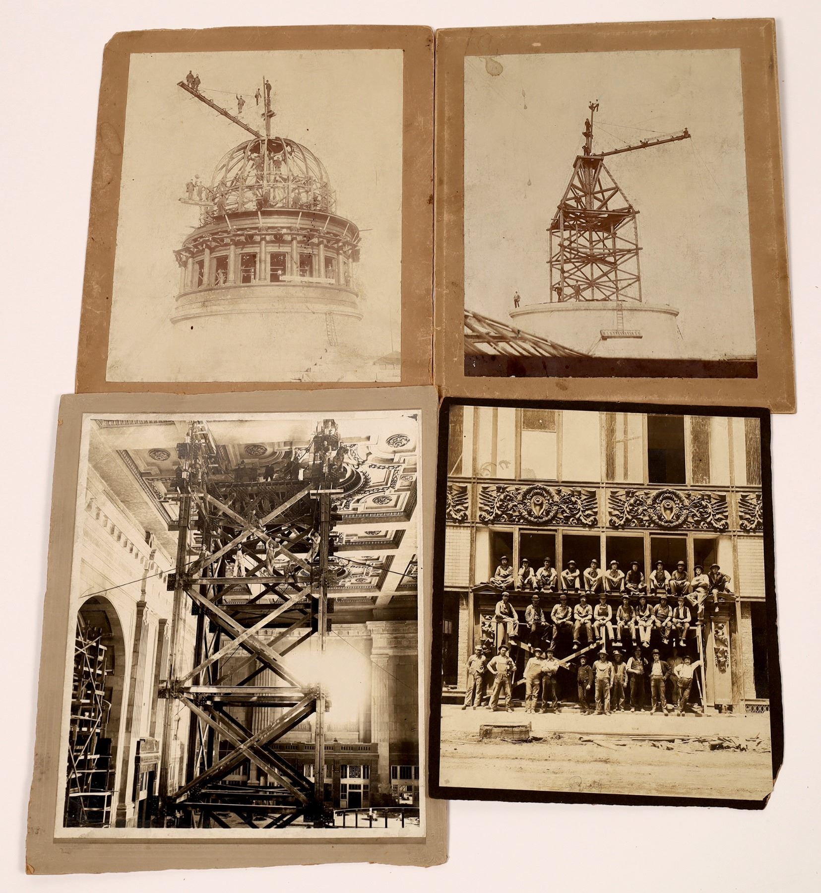 Lot of four vintage photographs of the construction of a domed building, circa 1890-1900. Three are 9 x 11 inches, one 8 x 10 of the construction crew.