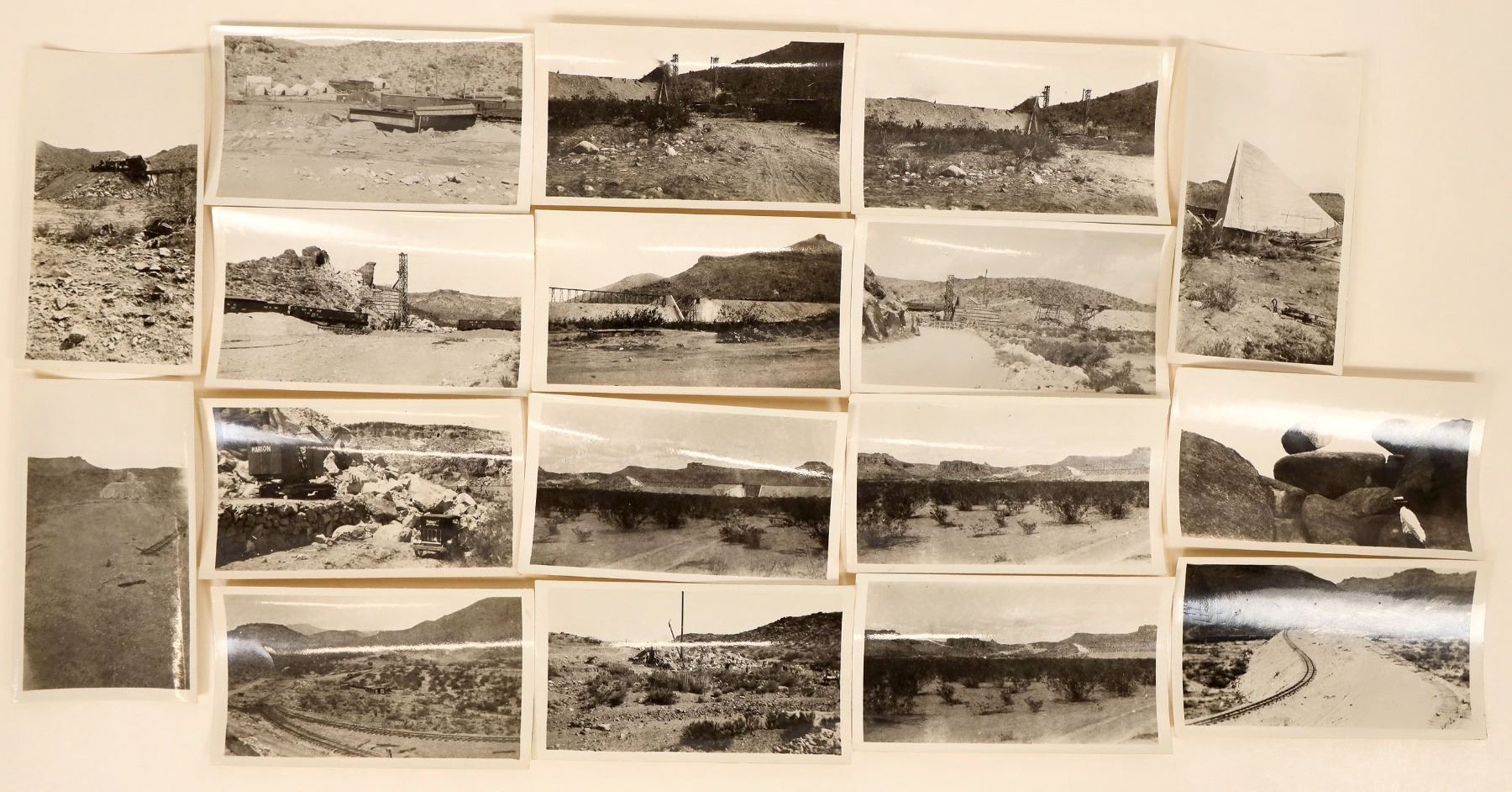 Sixteen 2.5 X 4 " B/W photo's of an unk mine or ? . In one photo of derailed train cars in the background a construction office rail car can be seen with a camp behind it. On the side of that car is a sign of "Sharp & Fellows Construction Co.". The company has been in operation since 1877 and still today builds, maintains and demolishes railroad infrastructure and track. They also built 2-6-0 loco #7 (now in a museum) for Minn. Land and Construction in 1902. It's also possible these photos are of the company involved in a rail project. Photo location is unknown.
