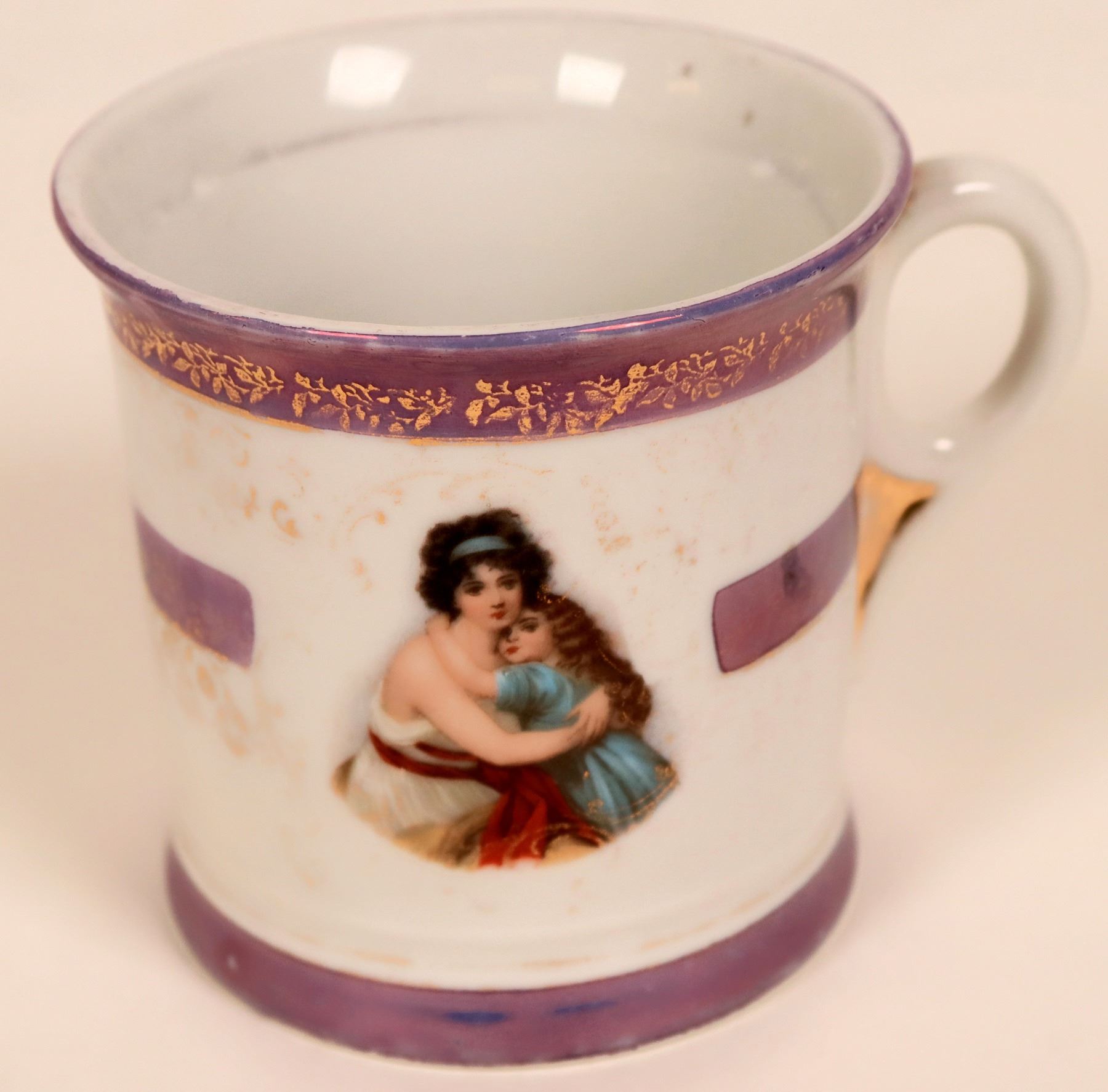 Classic vintage early twentieth century shaving mug, Gilt on violet glazed stripes with vignette of woman and child. Some gilt on white glaze has worn off. Does not appear to have had a person's name. Germany. 3.5" tall and same at lip.