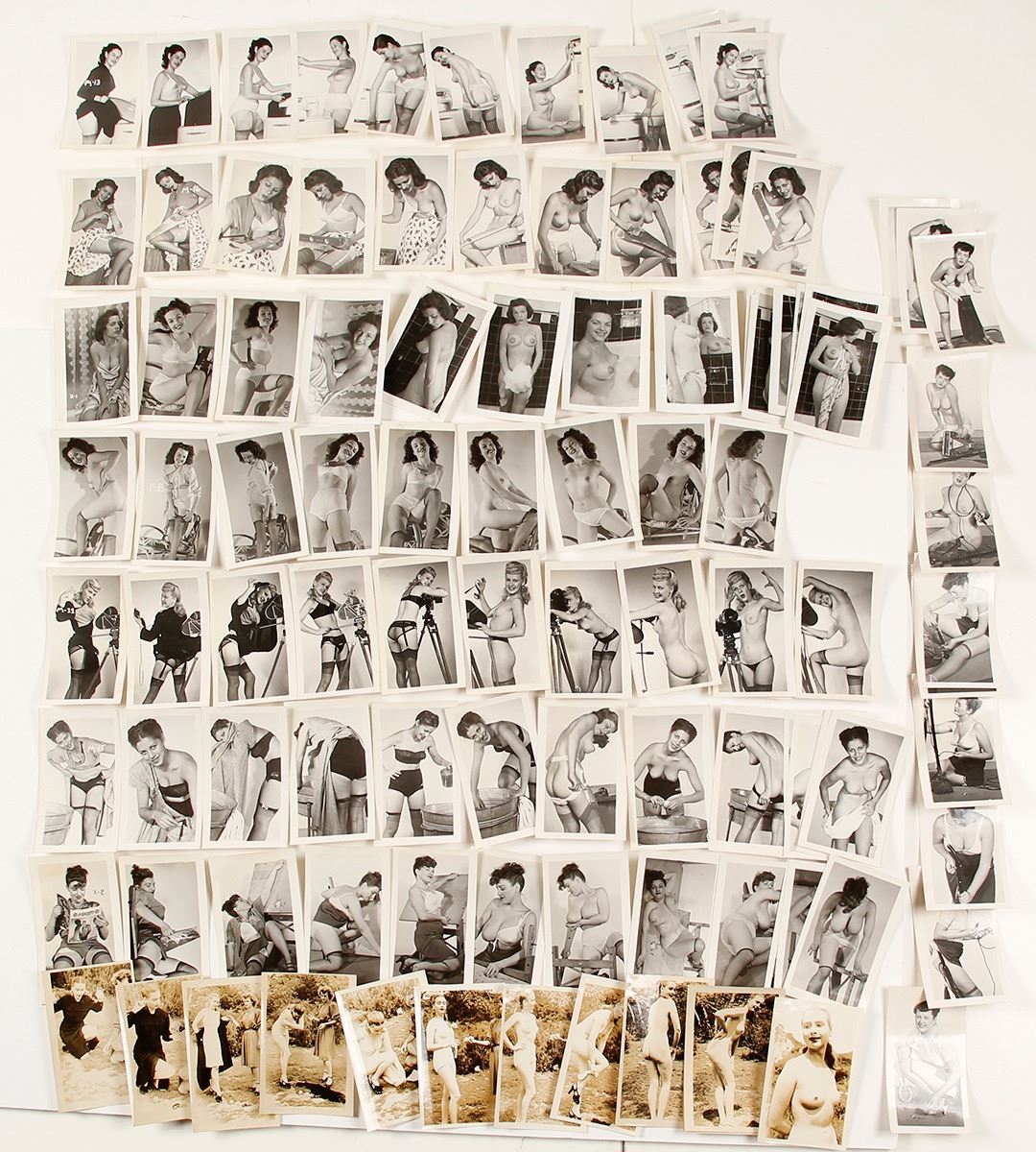 Collection of nine photo suites involving professional nude female models, all about 2.5 x 4" each. Each suite involves different models, and is composed of about ten photos each. Taken by an unknown professional photographer, these suites were clearly designed for publication in a magazine. Each has a somewhat humorous theme, from cleaning with a vacuum cleaner, to a friendly strip dice game. The suites start with the models fully clothed, then progress. There is no pornography here, only the modeling of the female (s). Date: Location: HWAC# 75213