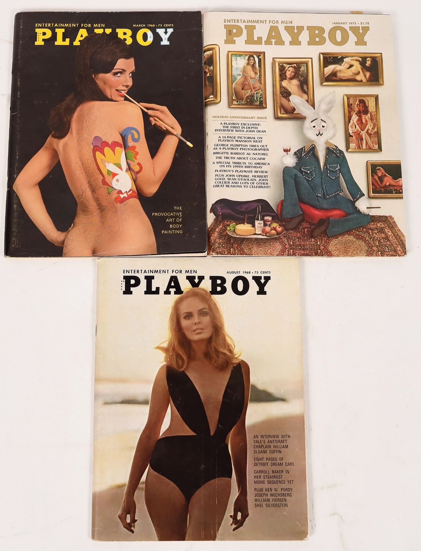 3 vintage Playboys. March 1968, August 1968 with 8 pages of Detroit dream cars. January 1975-John Dean interview, George Plimpton, Brigette Bardot, cocaine and Playmate review. 1 original green outer sleeve.