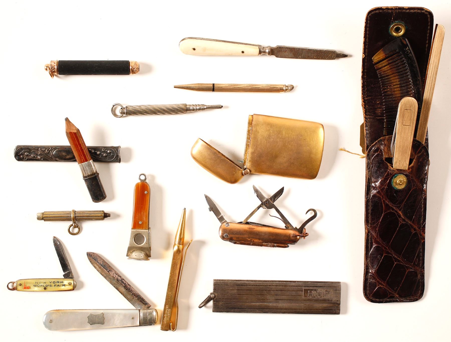 Lot of 14 pieces. Three pocket knives, one from the New York World's Fair, one mother of pearl handled. Several vintage mechanical pencils. Ivory handled metal emry board. Gold toned match box.