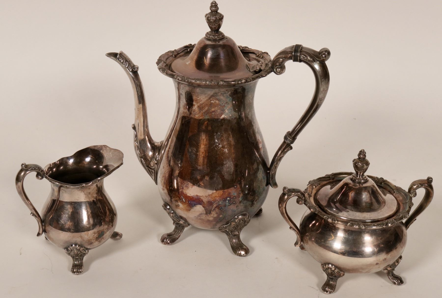 Silverplate coffee pot and creamer, EPCA Bristol by Poole sugar bowl w/ lid. All pieces in good condition.