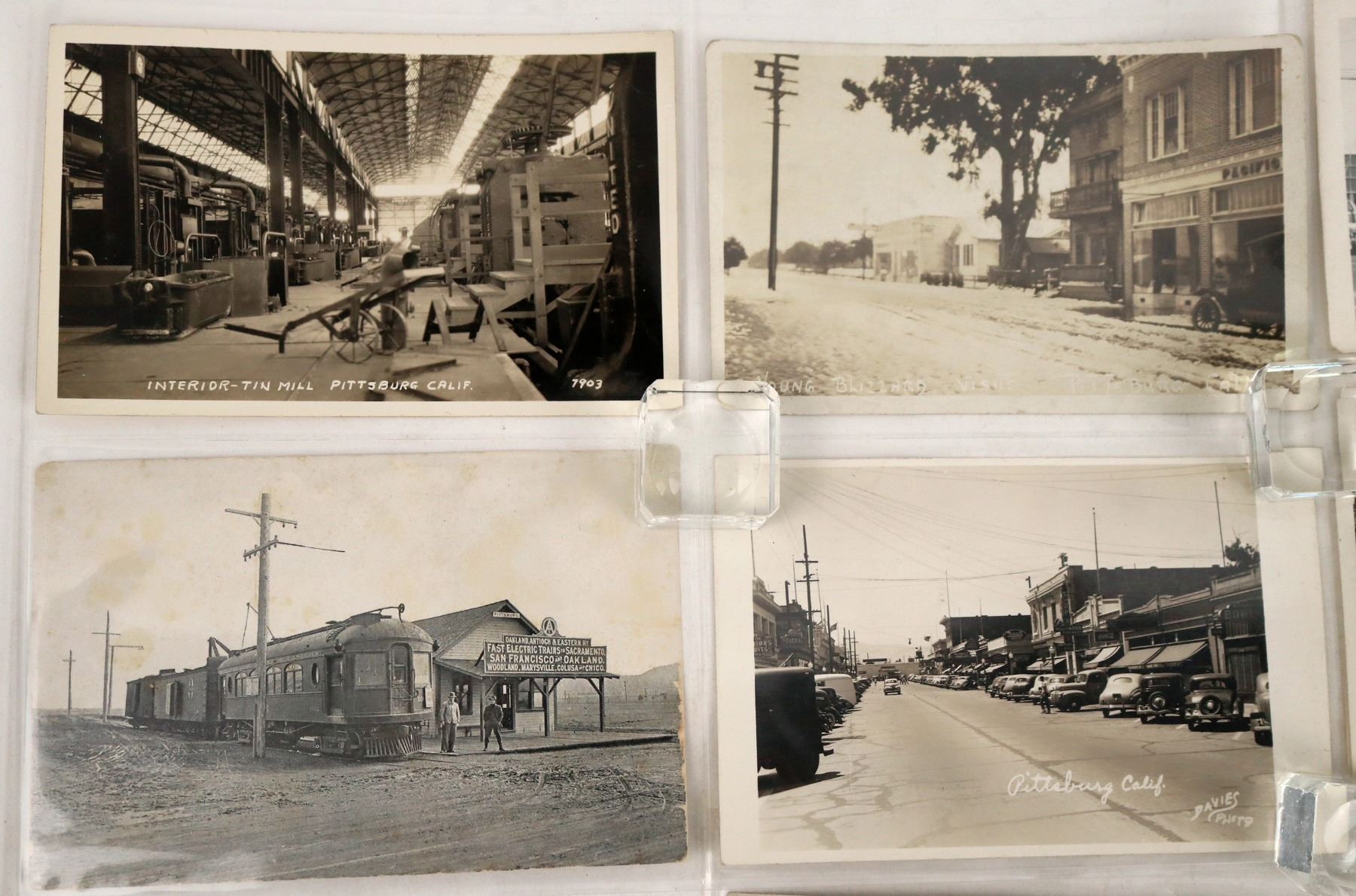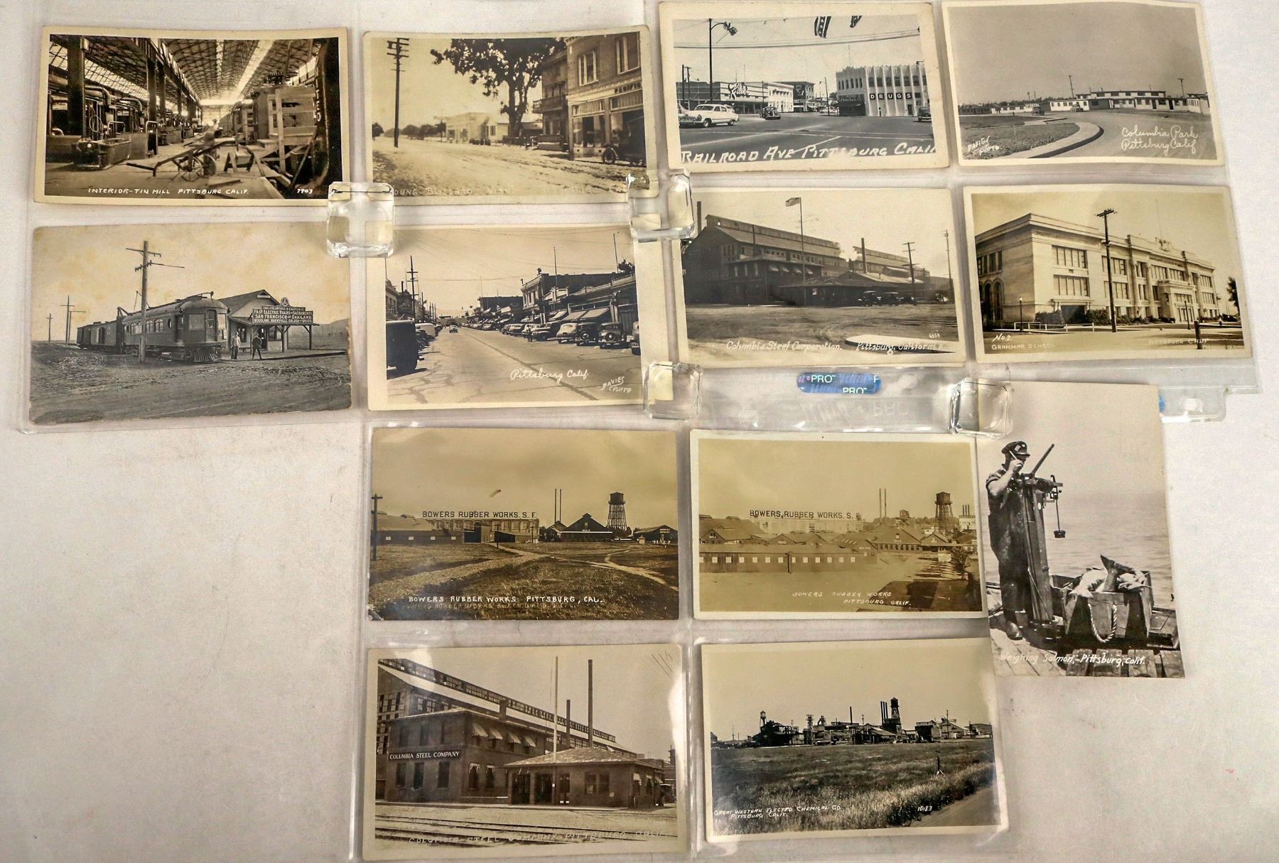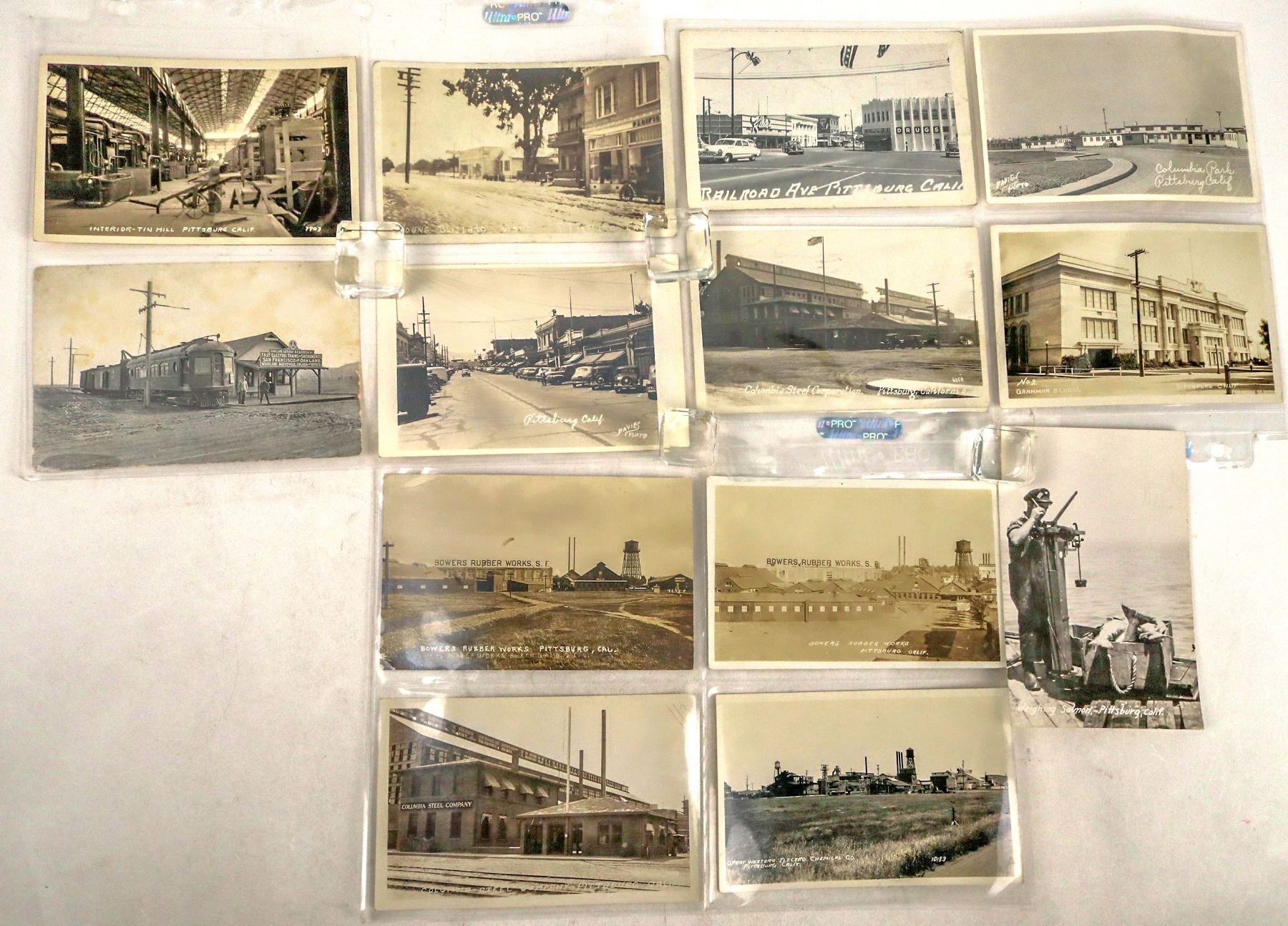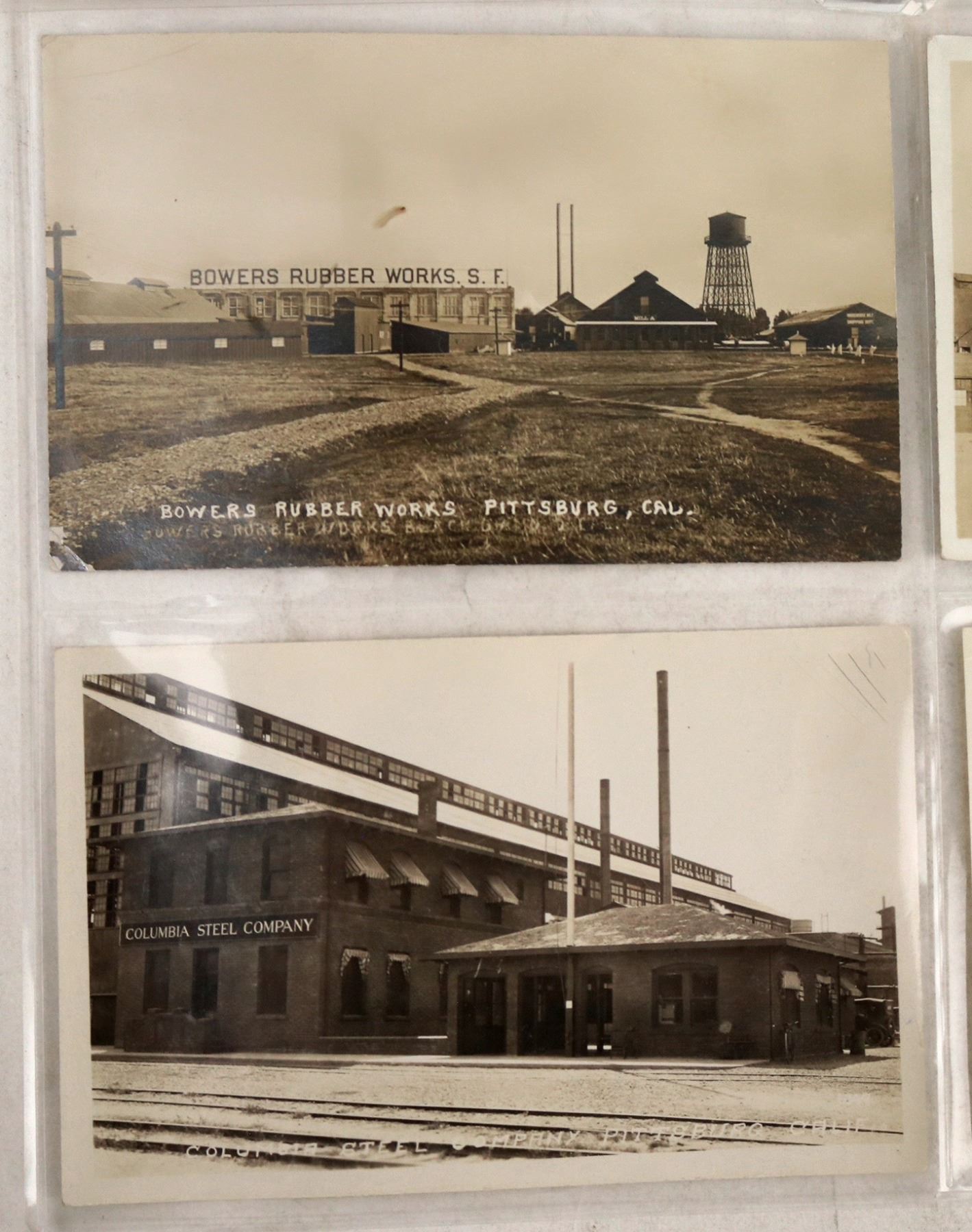 Lot of 15 vintage black and white real photo postcards of Pittsburg, California. Interior of a tin mill; weighing salmon; Bowers Rubber Works; Columbia Steel Company; Great Western Electro Chemical Company; Railroad Avenue; Columbia Park; Grammar School; A Young Blizzard Visits Pittsburg; Oakland and Antioch Eastern Railway Pittsburg Depot.