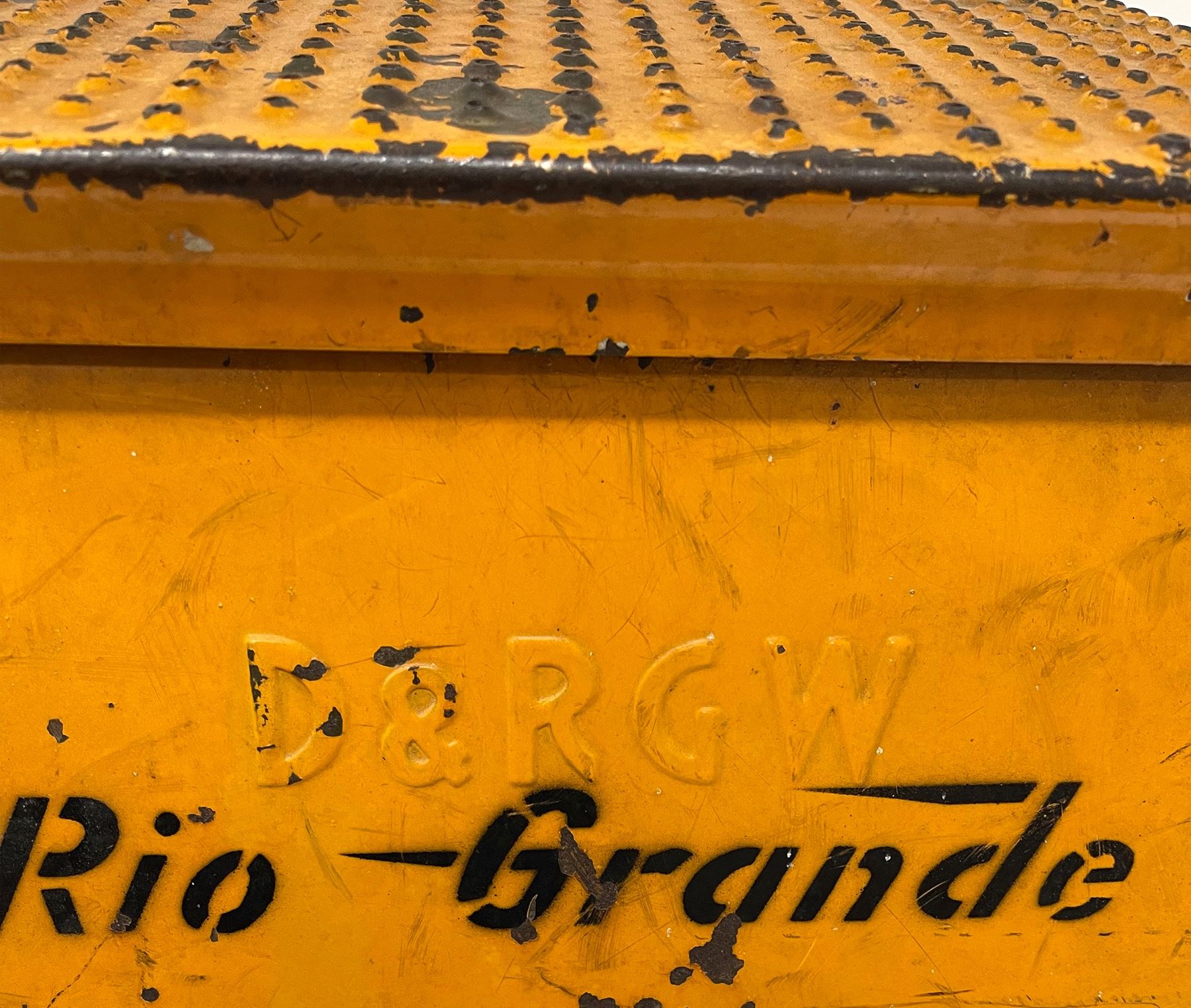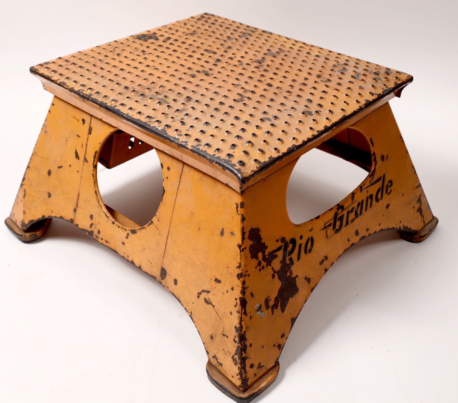 Lot of 1. Metal step stool from the Denver & Rio Grande Western Railroad. D&RGW reporting mark embossed/in relief on side of stool. Painted orange. Rio Grande in black ink on two sides. No other marks, est. c. early 1900s. Paint faded/gone along edges and all surfaces. Dimensions: (top) 13.5" x 15.5"; (base): 18.25" x 19.75"; height: 10.5". Weight: 17 lbs. Note: the D&RGW started in 1870 as a transcontinental bridge between Denver and Salt Lake City, UT. At its peak of fame in 1889 it was the largest narrow-gauge railroad network in North America encompassing 1,861 miles of track throughout Colorado, New Mexico and Utah. D&RGW became a division of the Southern Pacific Railroad in 1988 and ceased operations in 1992 (historical info from Wikipedia).