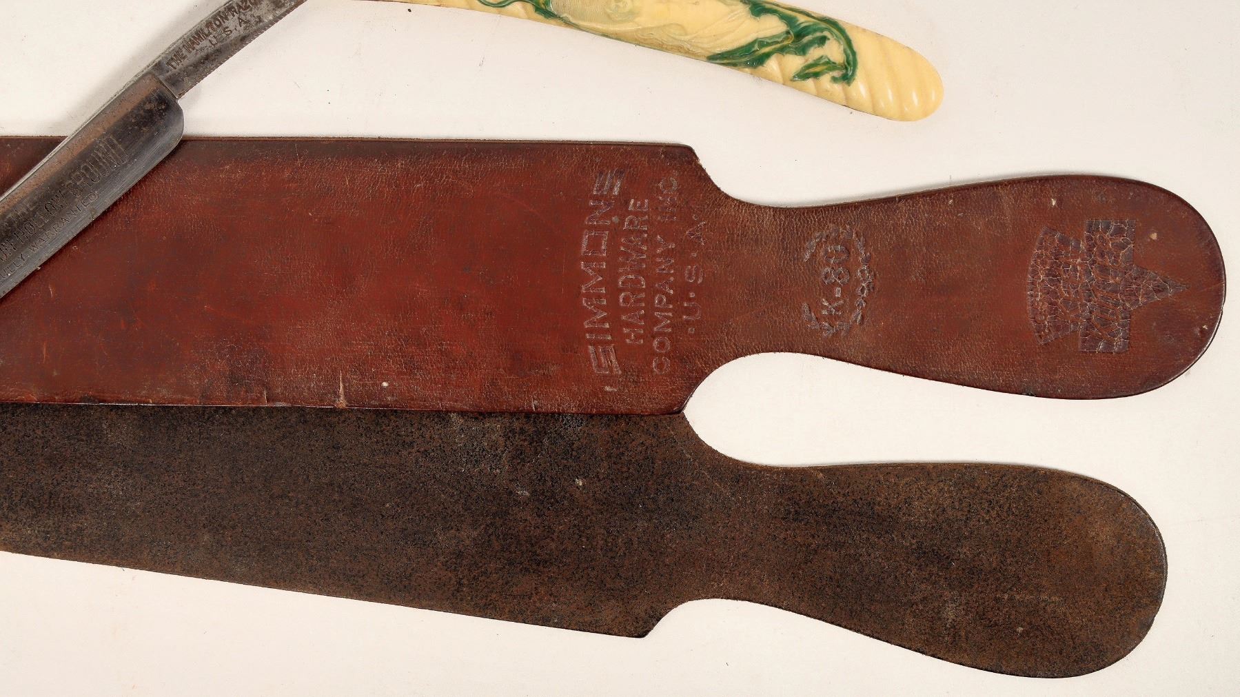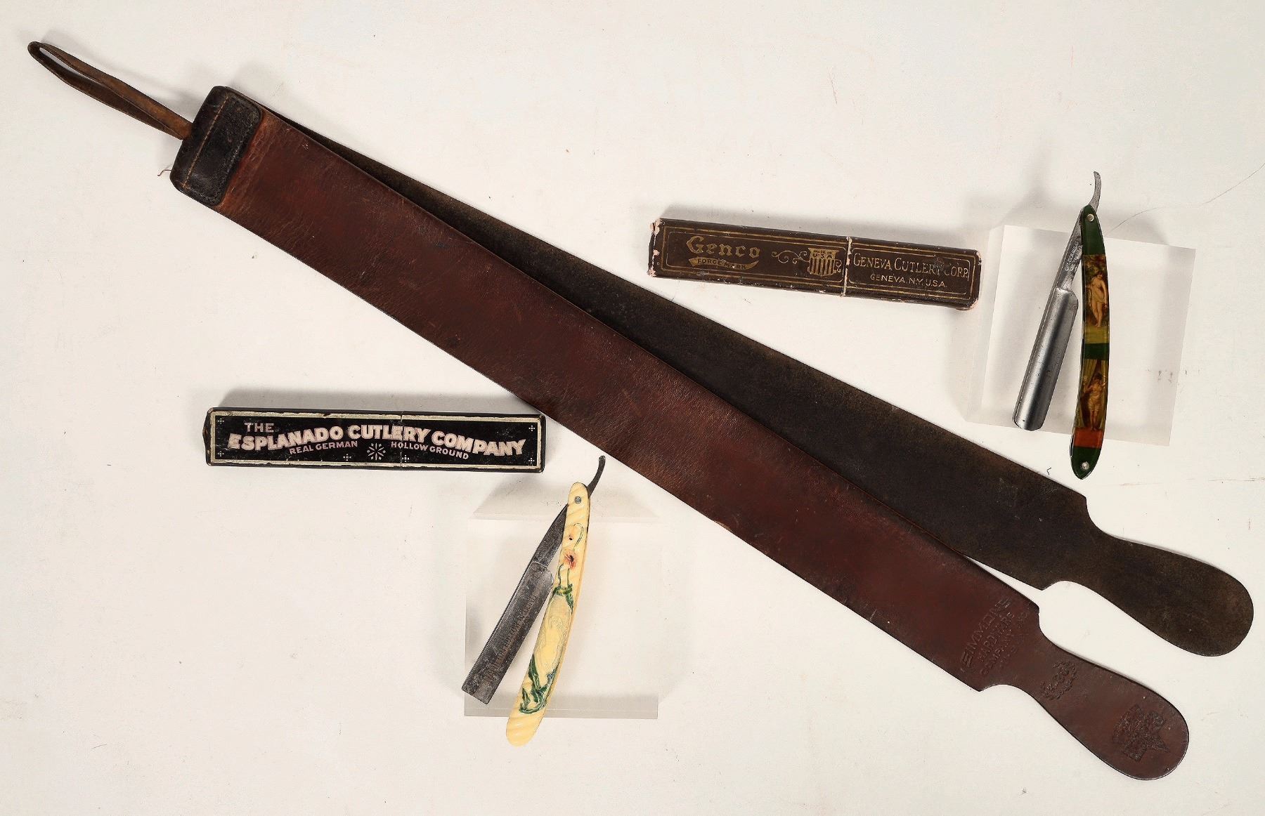 Lot of (3) items. Leather shaving strop by Simons, two straps for razor honing. 24" long with hanging loop. (2) straight razors, newer (post 1900's) manufacturers. Geneva Cutlery, with Bakelite handle (Scales) with "Pin-up" reproductions, and the Esplanado Cutlery Co. Scales are bakelite, carved to appear like ivory. Large hollow-ground blade reads "The Hamilton Razor Co.U.S.A." (Boxes may have been switched during history) Blades are approx. 4" long, scales are about 6" long respectively. Good condition, some tarnishing/ pitting on steel, see photos.