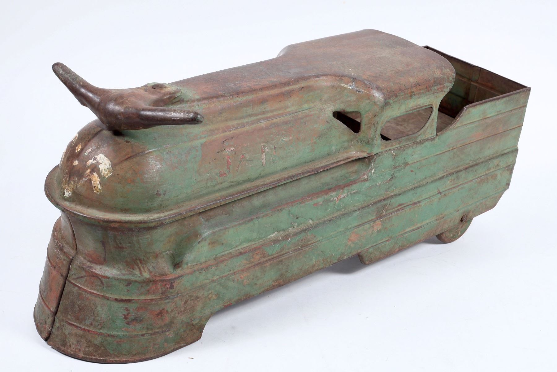 Vtg 1939 Worlds Fair Steelcraft Mercury Pressed Steel Ride-On Streamliner. These seem to be getting scarce and much rarer than the Marx equivalents. This is one of very few Steelcraft Streamliner trains based on fJ3 Hudson MERCURY .This style ride-on was produced from Christmas 1939-1940. I was told this version Streamliner was only sold inside the World's Fair Grounds but can not verify such. In restorable condition . Green paint has all but worn off, shows age, not dents or holes. Missing left front wheel. Extremely rare in any condition 24” L