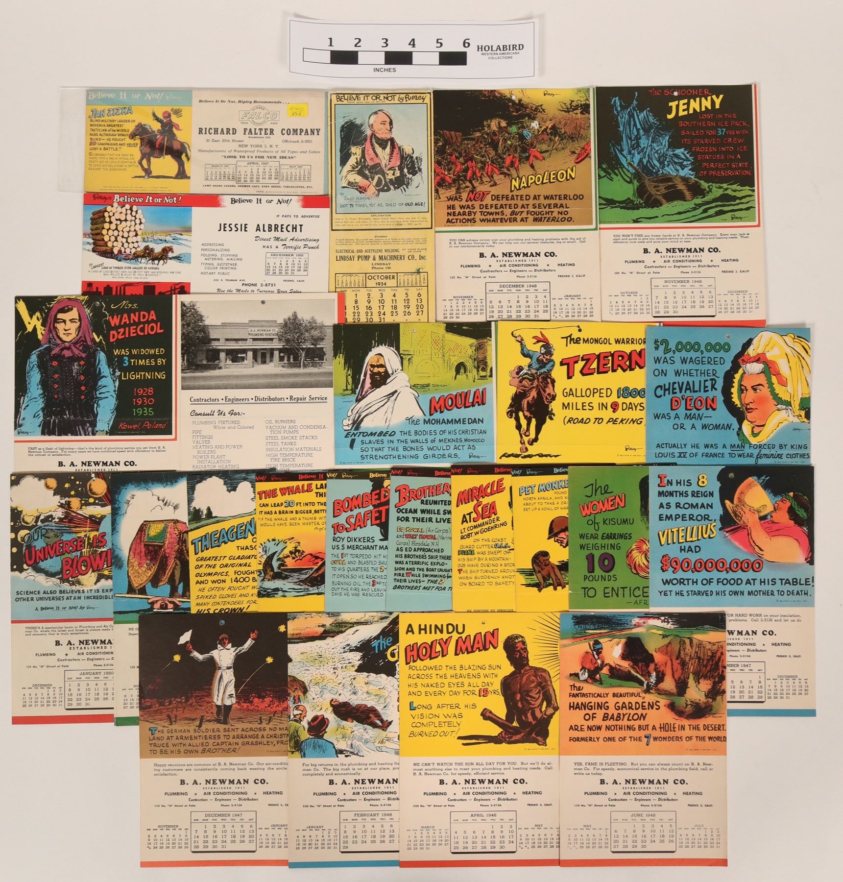 Lot of 25 items of ephemera related to Ripley's Believe It Or Not, c1934-1953. Includes three ink blotters with Ripley's facts on advertisements with calendars for Lindsay Pump & Machinery, Lindsay, CA (1934), Jessie Albrecht Direct Mail Advertising, Fresno, CA (1953), and Richard Falter Company, New York, NY (1947). Also 22 folded advertisements with monthly calendars for B.A. Newman Co., Fresno, CA, 1946-1949, with Ripley's Believe It Or Not on front, and inside. See photo for details.