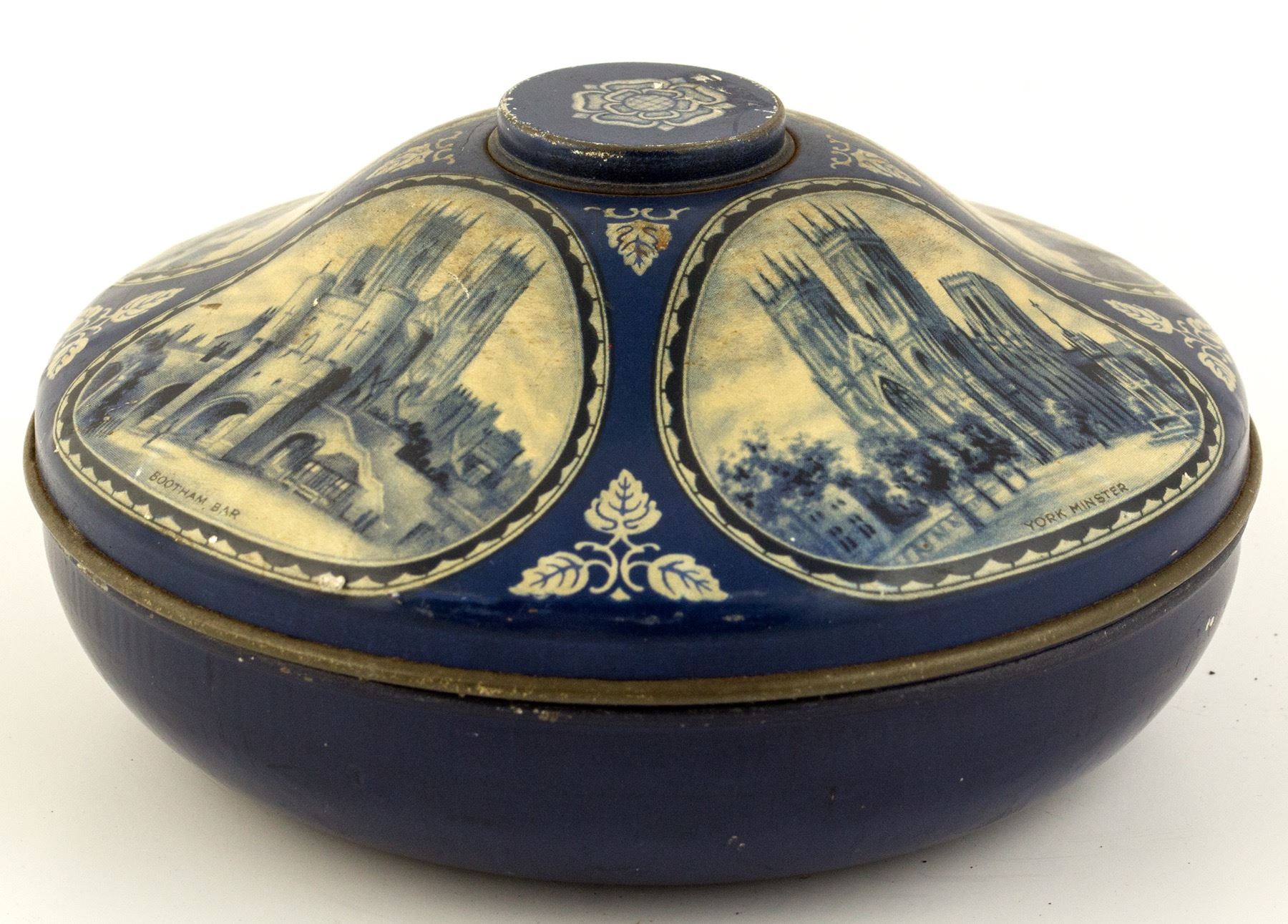Vintage Rowntree Tin, British. Scenes of York from the ouse, Bootham Bar, York Minster and Mickelgat Bar. Small dent and a chip on the base. State: City: HWAC#: 48360 Date: