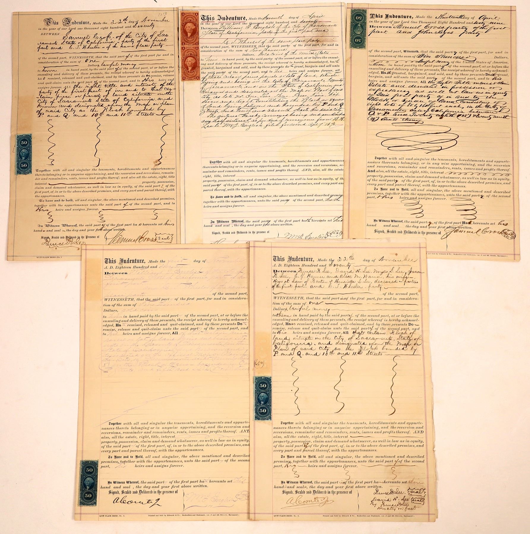 Lot of five property deeds transferring property in Sacramento from 1869 & 1870. All with adhesive revenue stamps. The properties between P & Q and 10th & 11th Streets are right downtown in California's capitol city.