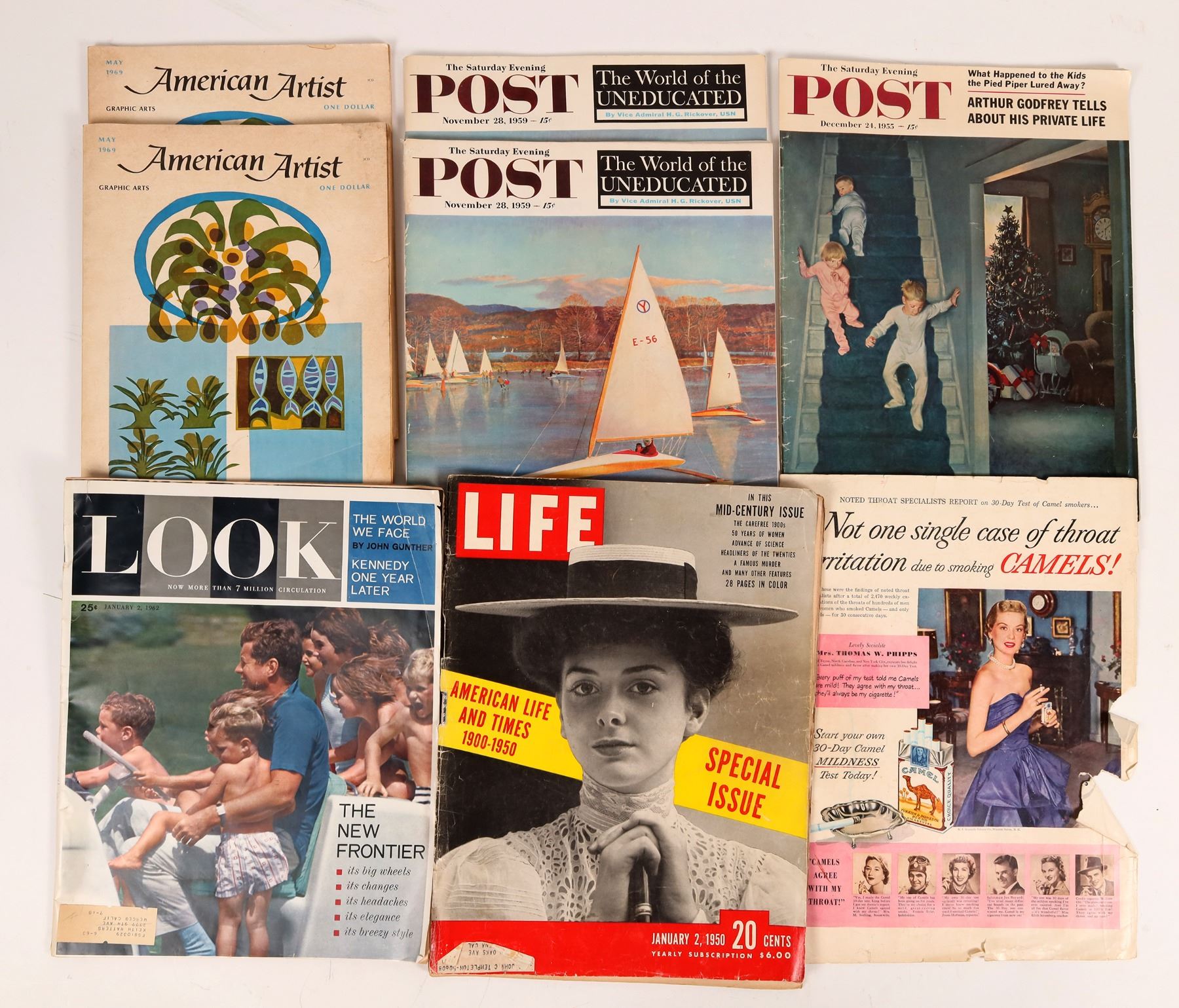 Saturday Evening Post December 24, 1955, 2x November 28, 1959. 2x American Artist May 1969. Look January 2, 1962 with JFK cover. Life January 2, 950 with detached cover.