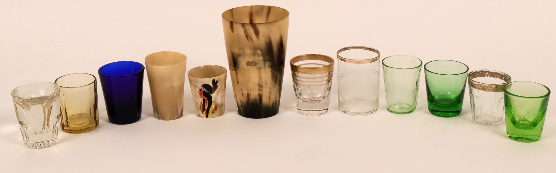 This is a group of nine vintage shot glasses. Eight of the glasses are unmarked, one embossed "The Hayner Distilling Company." Included in the lot is a cow horn drinking cup and two cow horn shot glasses. All are in good condition. See photos for more details.