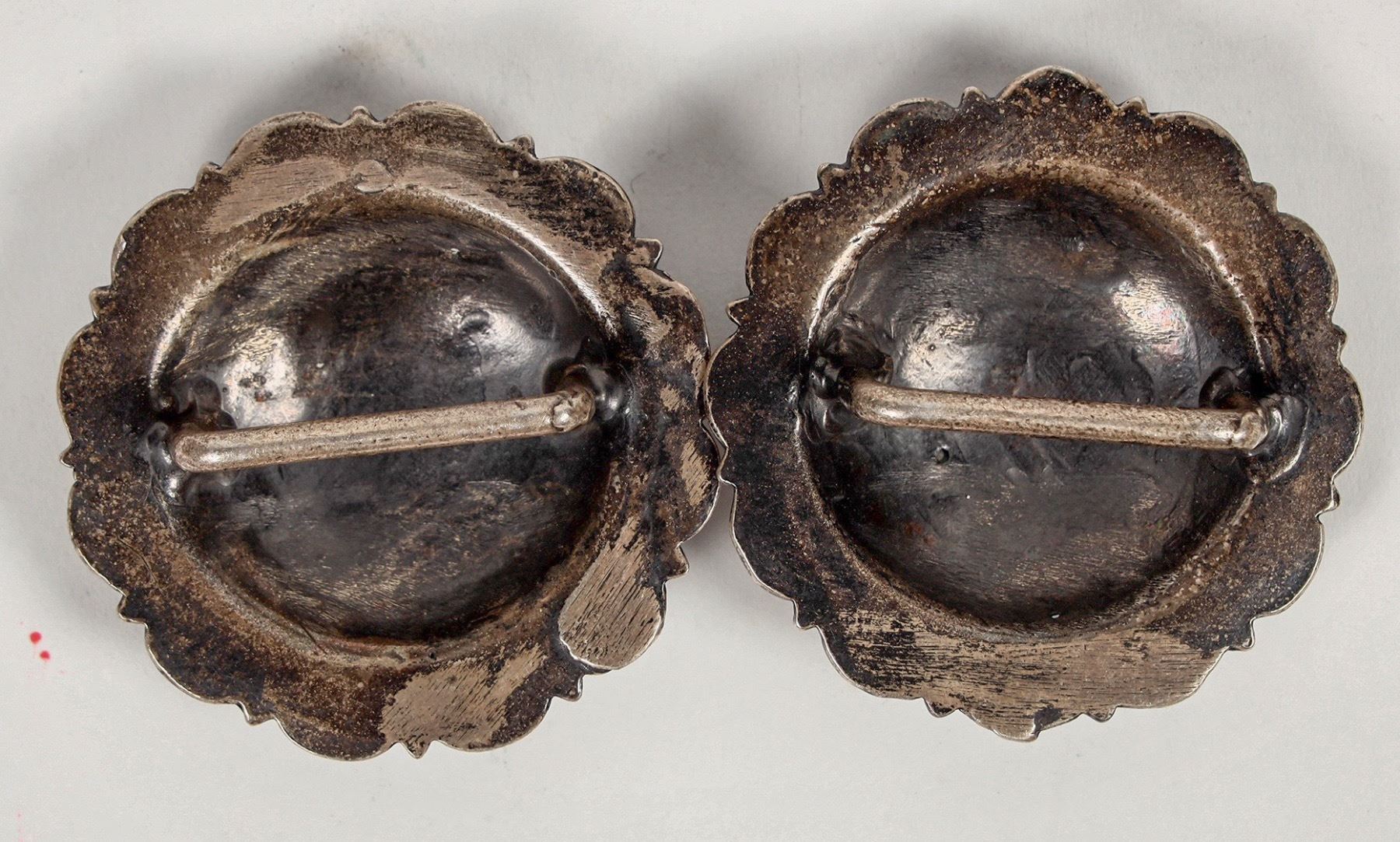 Two vintage silver conchos, unmarked, with bucking bronco and rider on each. Total weight 48 grams; 47 mm each.