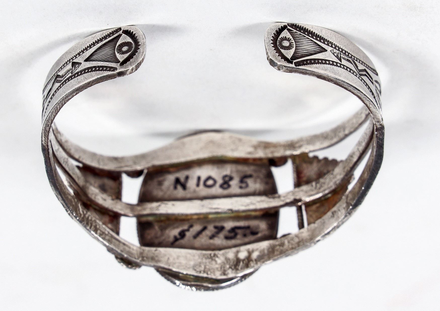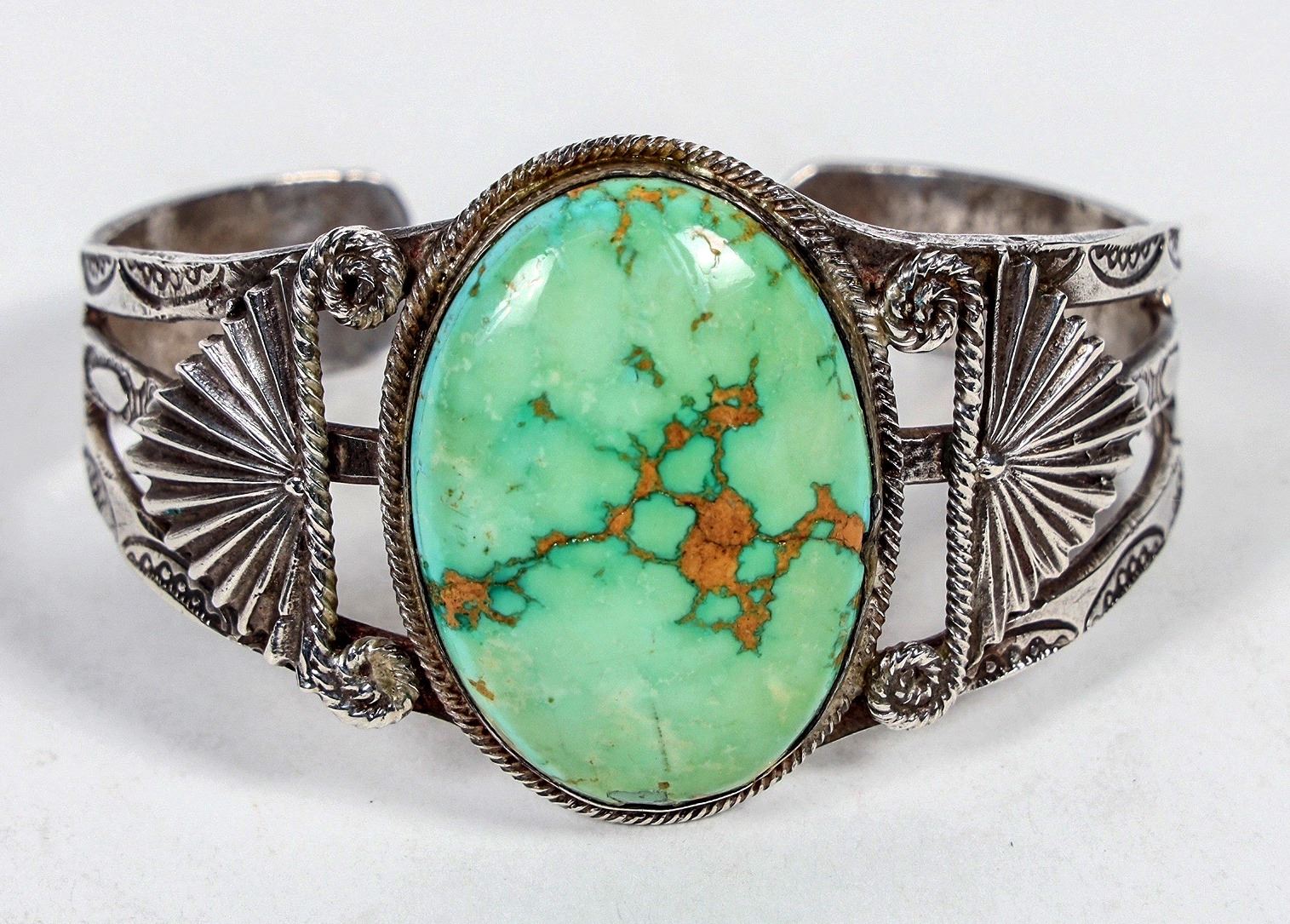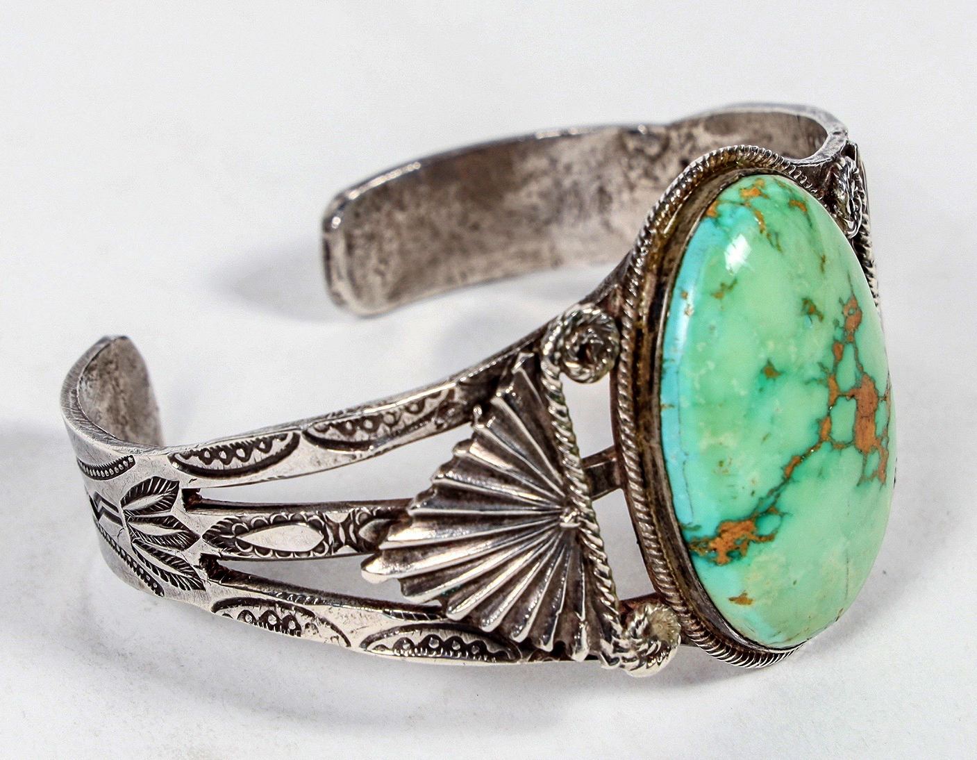 Green turquoise & silver bracelet, custom made. Incorporates art nouveau and Native American stylings. Bracelet circumference measures 6.8", width tapers from 1.75" to .35". Slight flex. Good condition, see photo. Not marked 925 - less purity silver.