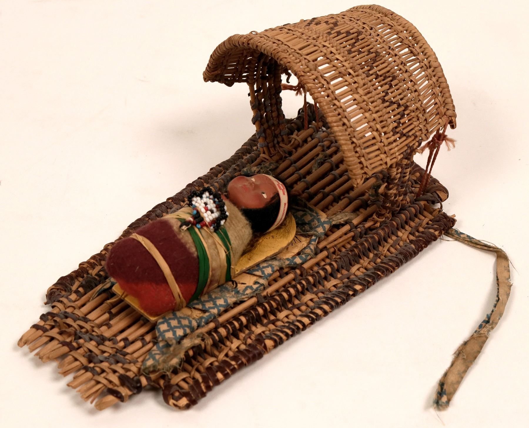 Skookum Indian doll papoose, on cradle board, The doll is an original wrapped in a Hudson Bay blanket, 4" x 2" x 1.5", very good condition. The cradleboard is woven willow and is in good condition--8.5" x 5" x 4". The cradleboard is probably older than the doll, and they were probably put together at some point later. There is an original papoose board attached to the wicker cradleboard. A Skookum doll was a Native American themed doll, sold as a souvenir item in the early 20th century. Although considered collectible, they are not authentic Indian dolls, as they were designed and created by a white woman, and quickly mass-produced. Originally designed by Mary Dwyer McAboy (1876-1961).