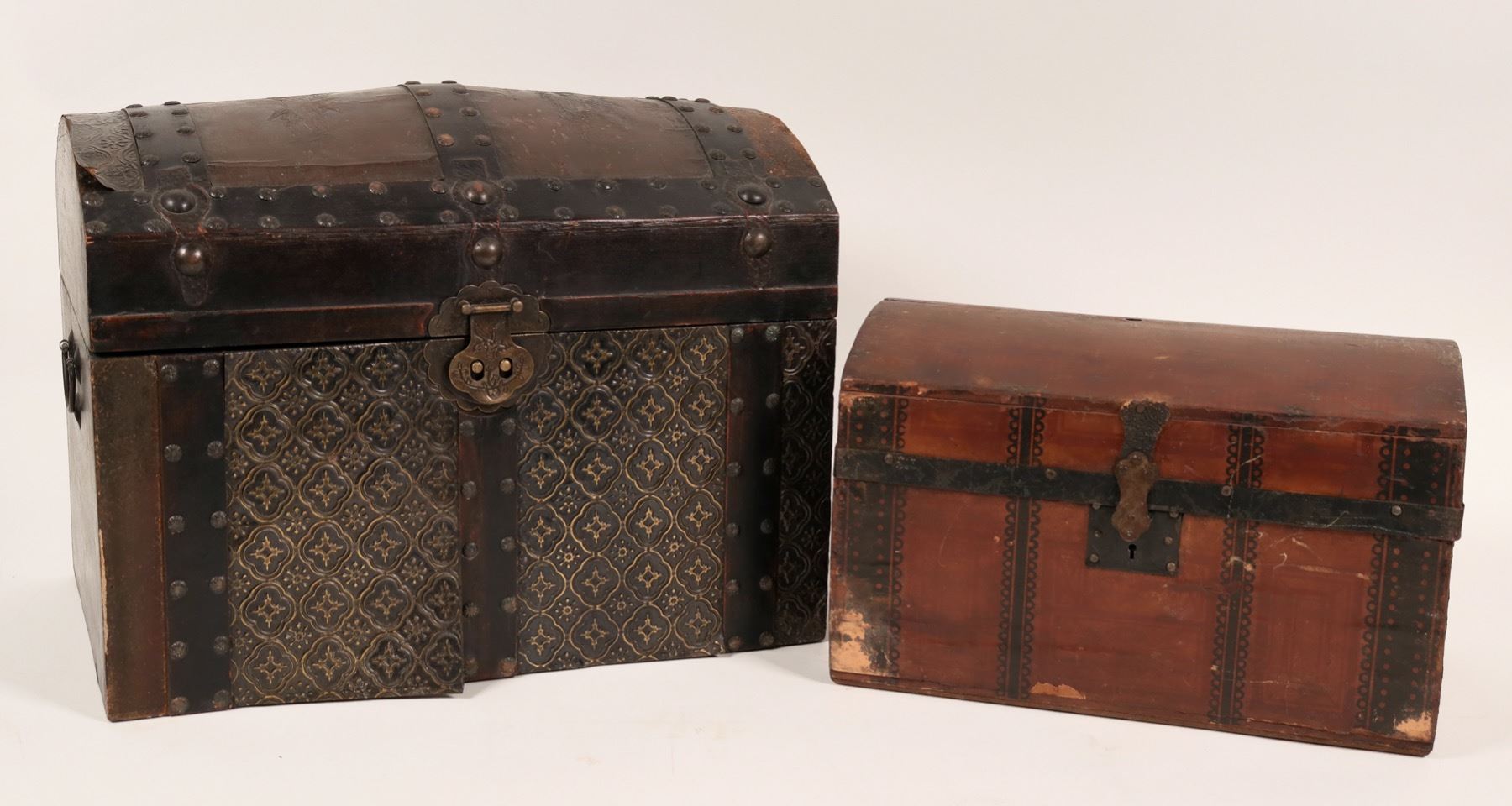 Two small, curved top chests. The smaller of the two measures about 14 x 9 x 9" tall. Has original tray in the top. square nail construction, wall paper adorns the outside and on the internal tray. Trade card adhered to inside top, as original. Possibly a child's chest. Nice. The larger is 18 x 12 x 13" tall, made to resemble a classic "treasure chest". Old style hasp on the outside. 20thc.