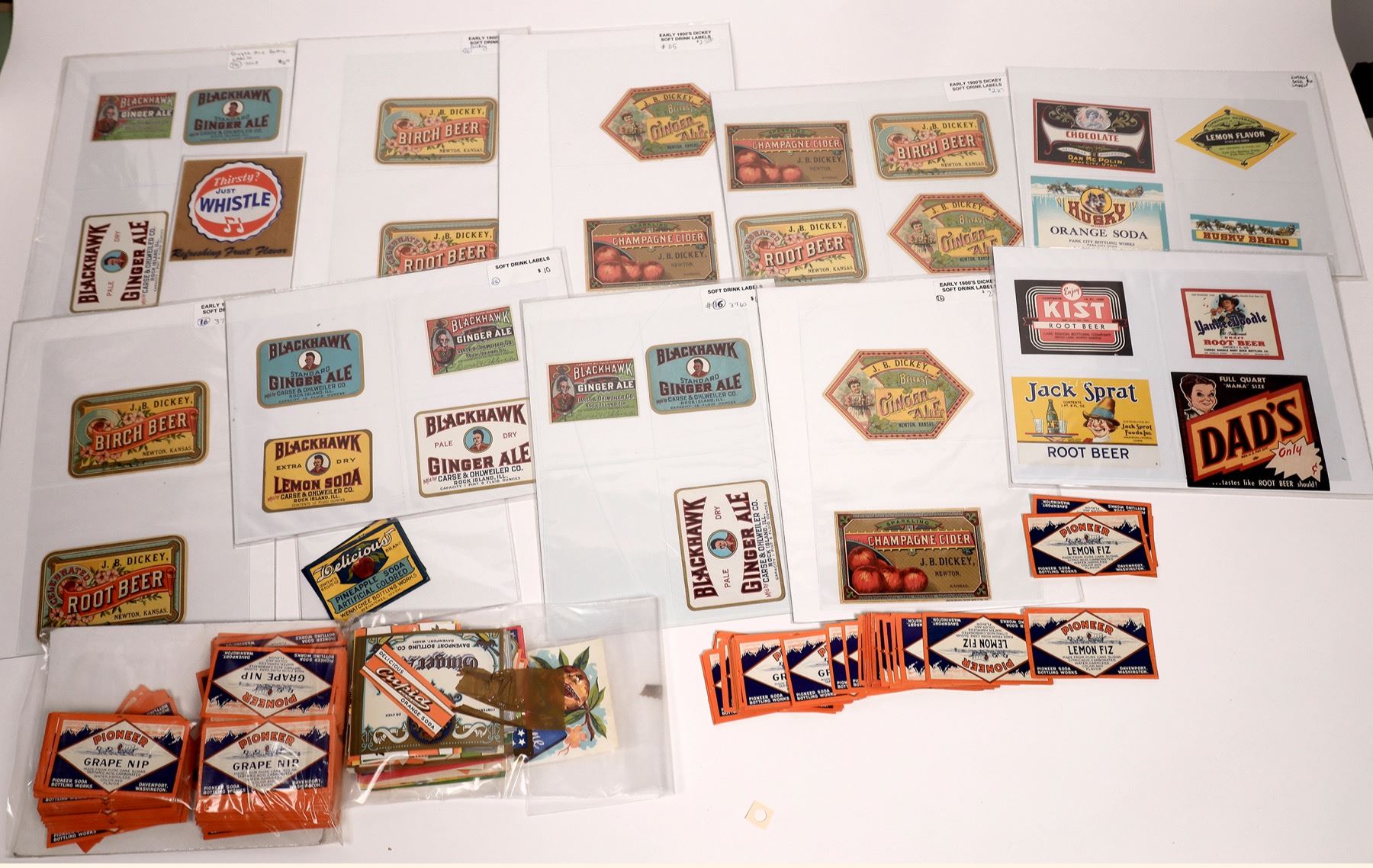 Over 100 vintage soda labels from the early 1900s. A hoard of about 80 orange and blue labels from Pioneer Grape Nip; Pioneer Soda Bottling Works of Davenport, Washington. Blackhawk Ginger Ale of Rock Island, Illinois; Champagne Cider, Birch Beer, Root Beer and Ginger Ale from J. B. Dickey of Newton, Kansas; Husky Brand Orange Soda, Park City Bottling Works, Utah; root beer labels: Kist; Yankee Doodle; Jack Sprat; Dad's; Lasko Strawberry beverage; Cray's Grape Soda, Holyoke, Mass. State: City: Date: Provenance: Stuart Mackenzie Montana Ephemera Collection