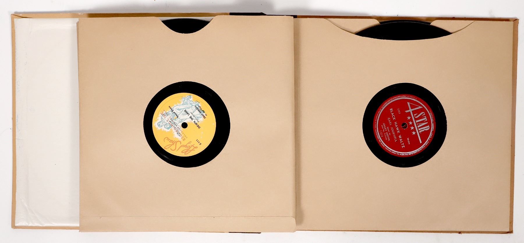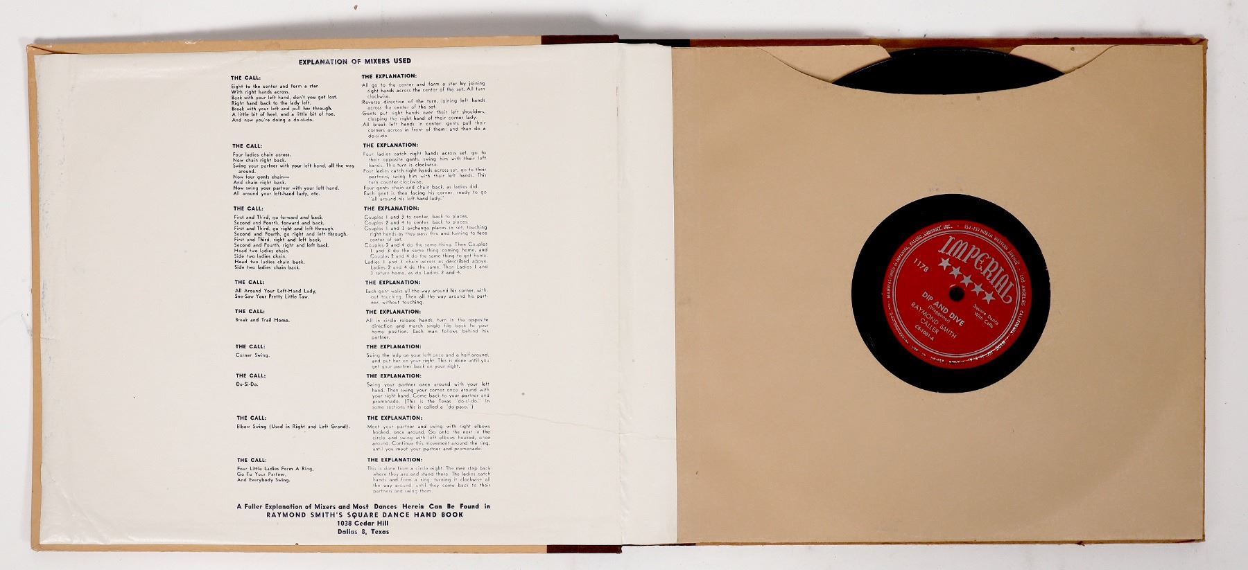 The album 'Square Dances [with] calls by Raymond Smith: Here I Go In My Little Red Wagon', c. 1950. Five 78rpm records in total. The album includes two Raymond Smith records; the others have been replaced by three different dance music records.