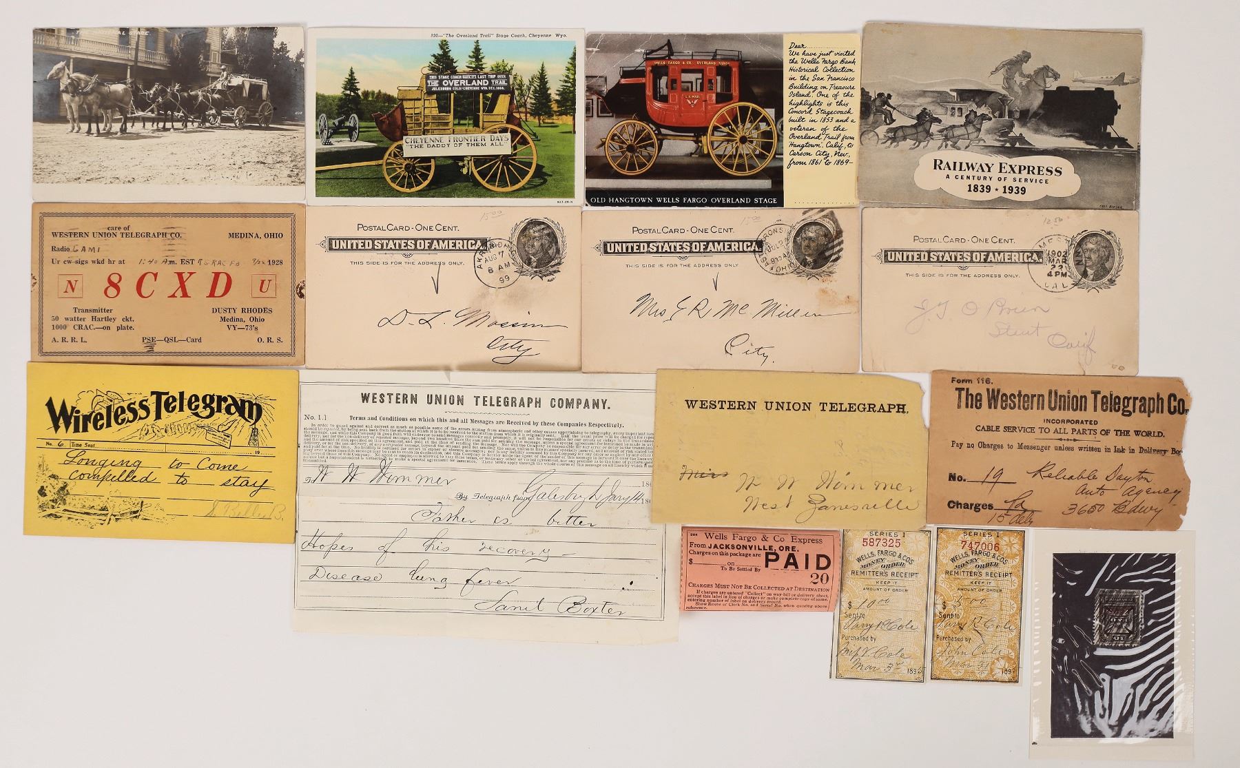 Lot of 16. 1. Wells Fargo & Co. : Two money order remitters receipts 1895, one paid package receipt. 2. Western Union : Telegraph envelope and telegraph dated 1860, second envelope unk date, pre-split post card w/transmitter numbers dated 1928. 3. Two pre-split , imprinted Jefferson image 1 cent US of A post cards: One from United Express Co and one from Adams Express Co. dates 1899. 4. Divided post cards : Wireless Telegraph no date, two Railway Express 1839-1939 w/pic of stage-train-pony express. Three post cards of stage coached : One Wells Fargo "Old Hangtown" and the "Overland Trail" coach. RPC six horse team soft side "The National Stage". 5. Picture of a stamp "10, B&O, Commutation" imprinted. 1860-1928 Ken Prag Collection